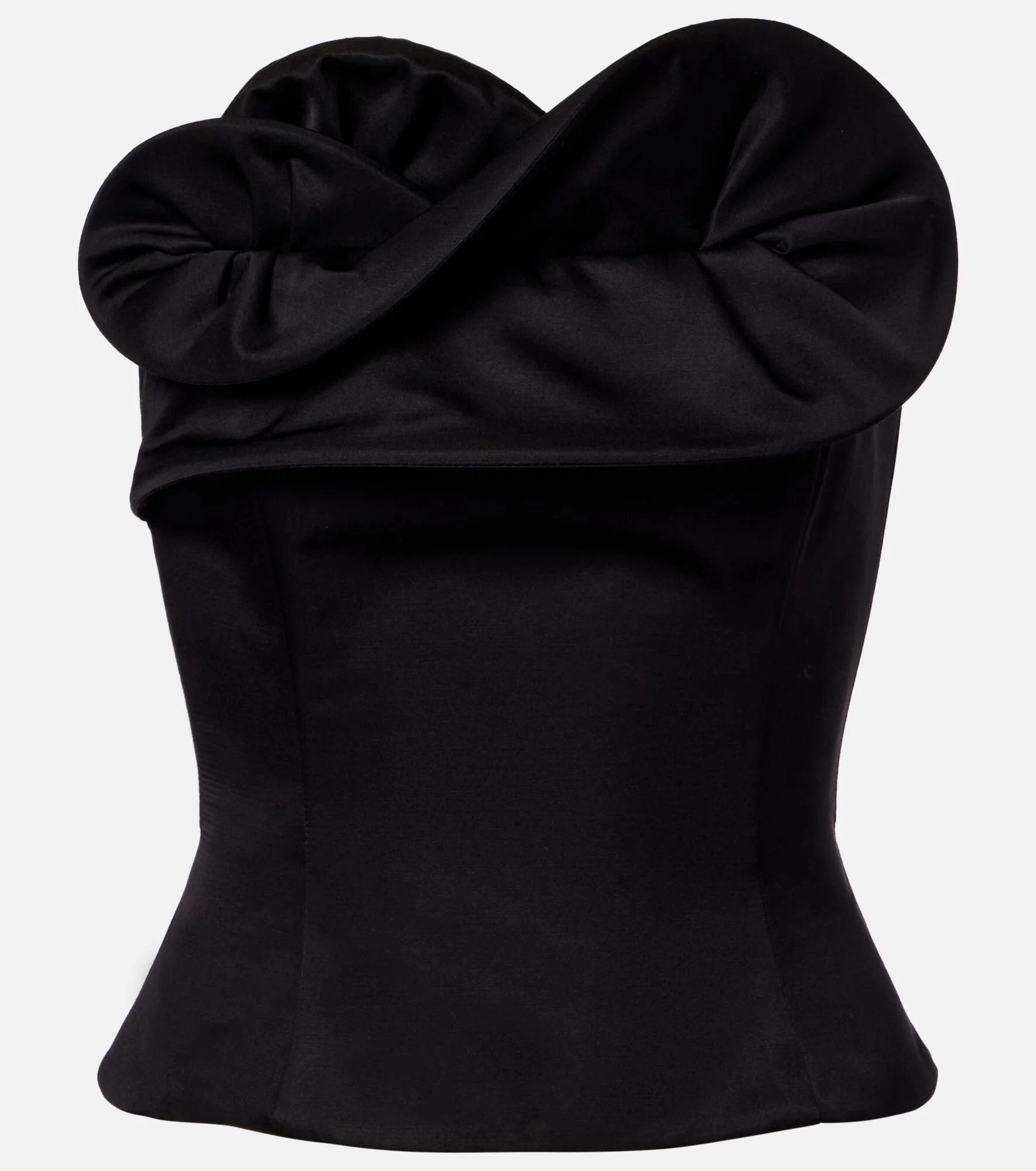 Magda Butrym aims to empower with sharp modern style, expertly delivered through artisanal excellence. This bustier top is made from wool and silk and has sculptural ruffles on the front. Product Details - Material: 58% wool, 42% silk - Care instructions: dry clean - Made in Poland - Color: black - Designer color name: Black - Lining: 100% silk - Boning - Closure: concealed zipped back - Item number: P01130927 Size & Fit - True to size - Strapless - Internal boned corset for support - Fitted - Non-stretchy fabric - Slightly cropped - The model seen in the picture is 178cm-5'10" and wearing a size FR 36