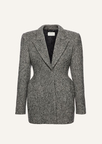 A meticulously tailored wool and cashmere blazer designed with Magda Butrym's signature sculpted silhouette. The exaggerated hip pads create a distinct hourglass shape, giving structure and femininity to the fit. This piece blends menswear-inspired tailoring with couture-level craftsmanship, finished in a textured grey melange weave. Wear it as a blazer or mini dress for a statement look. Details ID: 214925 Shell 67% Wool 29% Cashmere 3% Polyamide 1% Silk. Lining 100% Silk. Sizing This piece fits true to size. We recommend you get your regular size. Model is 177 cm and is wearing a size 34.