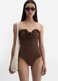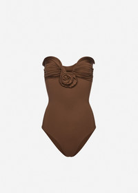 Embrace pool-side elegance with this rose bustier swimsuit. Featuring a sweetheart neckline with ruffle accents and a signature rosette at the center, this piece combines refined structure and femininity. The contoured silhouette creates a flattering fit, making it a standout addition to any swimwear collection. Details ID: 608426 Shell 80% Polyamide 20% Elastane Sizing This piece has a regular fit. Model is wearing a size 34.