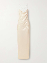 EDITORS'NOTES Magda Butrym's maxi dress is made from tulle that's saturated in reflective, overlapping sequins for a glamorous finish. It's designed for a figure-skimming fit and has a draped bodice and slim straps that cross over at the open back. The deep split allows you to show off the season's colorful tights. SIZE & FIT Model measurements: - Fits true to size, take your normal size - Intended for a slim fit - Long in length, may wish to alter - Mid-weight, heavily embellished, non-stretchy fabric - Model is 177cm/ 5'10" and is wearing a FR 34 - Bust: 79cm/ 31" - Waist: 61cm/ 24" - Hip: 89cm/ 35" DETAILS & CARE - Cream sequined tulle - Button fastenings along side - 100% polyester; lining: 100% silk - Dry clean