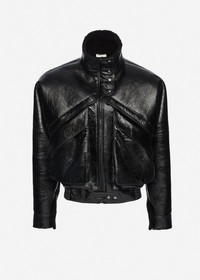 Black shearling aviator jacket with a glossy leather exterior and soft interior lining. Designed with a high collar that fastens with snaps, oversized front pockets, and a zip closure. The silhouette is structured with detachable shoulder pads for adjustable volume. Finished with a belted hem. Details ID: 129426 Shell 100% Sheep Leather Lining 100% Viscose Sizing This piece has a regular fit. Model is wearing a size 34.