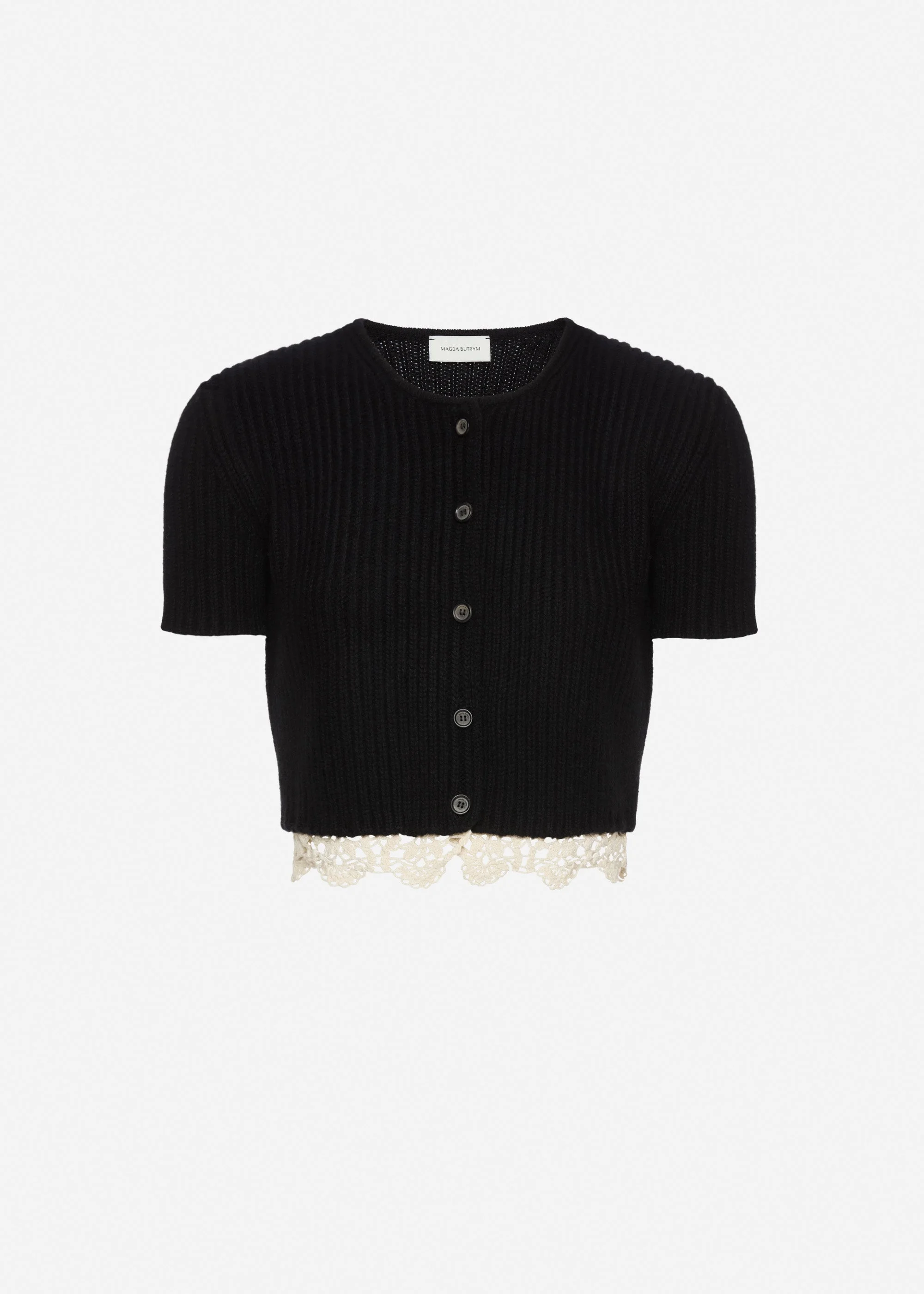 Short-sleeve cropped cardigan crafted from soft cashmere. Features a front button closure and delicate crochet lace trim along the hem. Details ID: 321426 Shell 100% Cashmere 100% Cotton Sizing This piece has a slim fit. Model is wearing a size 34.