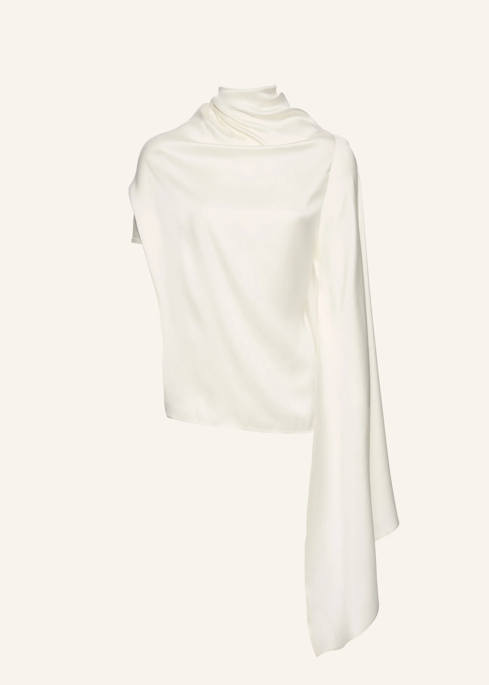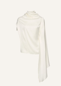 An elegant silk blouse featuring an asymmetrical silhouette with a high draped neckline and an elongated built-in scarf detail. Sleeveless with a dramatic open back, the blouse is fastened at the neck and down the center back with covered buttons. Details ID: 273925 Shell 100% Silk. Sizing This piece fits true to size. We recommend you get your regular size. Model is 177 cm and is wearing a size 34.