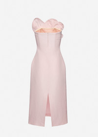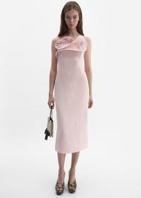 A refined below-the-knee dress crafted from silk. The silhouette is structured yet fluid, featuring a fitted bodice with an internal corset that enhances the waist and bust. The neckline is adorned with a sculptural folded overlay, shaped into a floral swirl. Closes at the center back with a concealed zipper and a delicate slit beneath for ease of movement. The inner corset secures with hook-and-eye and bra closures for a seamless finish. Details ID: 283426 Shell 100% Silk Lining 100% Silk. Sizing This piece has a slim fit. Model is wearing a size 34.
