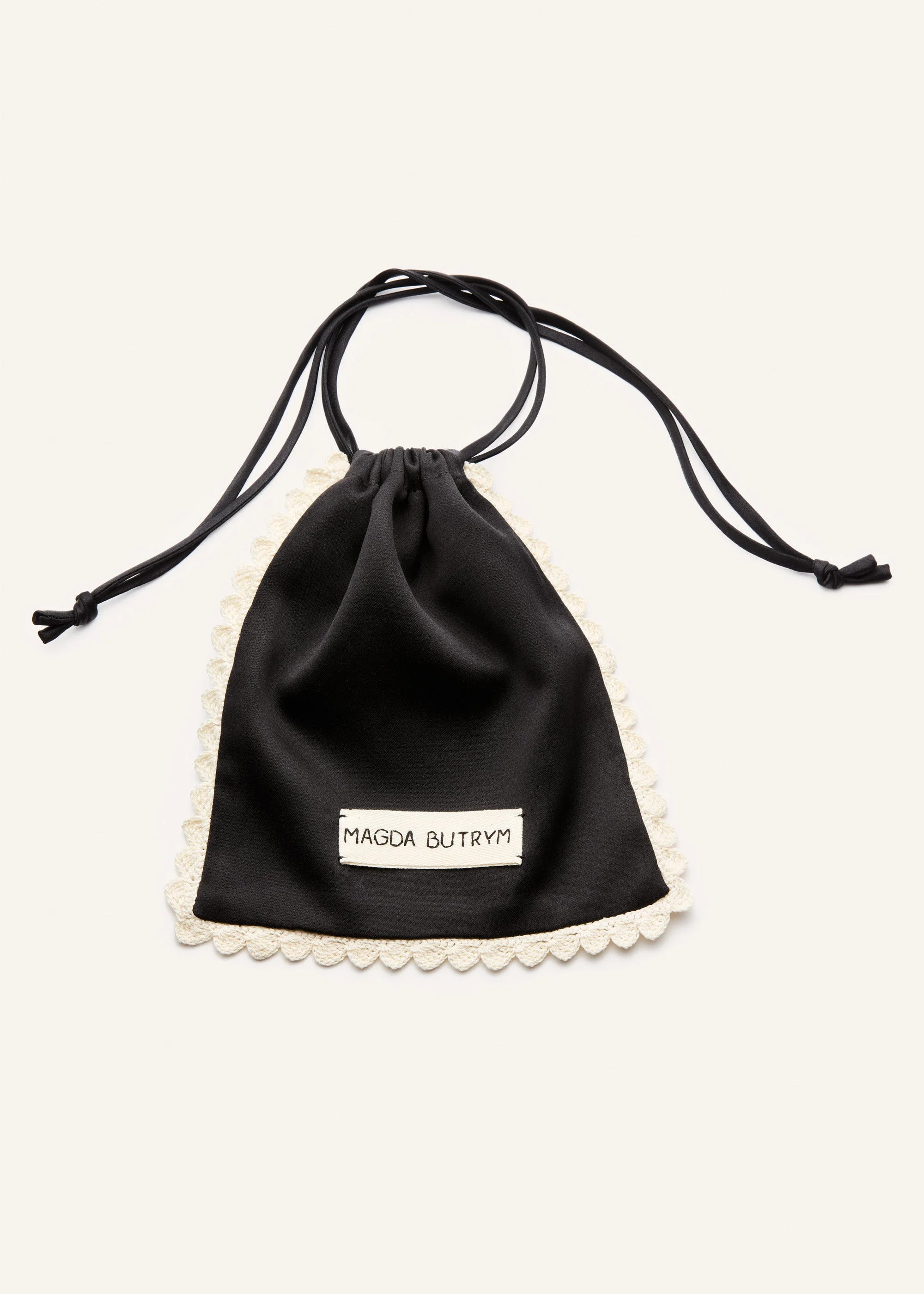 A refined pouch crafted from smooth black silk, elevated with delicate white crochet trim that adds a handmade, artisanal touch. The minimalist silhouette is secured with a slender drawstring closure. Perfect as a chic accessory for carrying small essentials or for adding a unique accent to evening ensembles. Available exclusively at magdabutrym.com and at the flagship boutique. Details ID: 990525 Shell [1] 74% Silk 26% Wool [2] 100% Cotton Sizing Approximate measurements: 20 cm x 18 cm x 20 cm