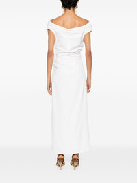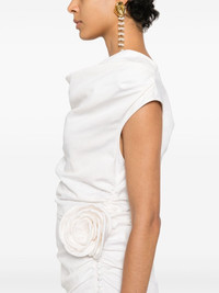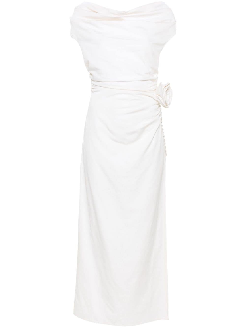 wrap shoulder silk midi dress Highlights - Cream white - Silk - Wrap shoulder - Side button fastening - Off-shoulder - Sleeveless - Floral applique - Side slit - Unlined - Straight hem Imported Composition Silk 100% SIZE & FIT Model measurements Height 5 ft 10 in(1.77 m) Bust/Chest 31.88 in(81 cm) Hips 35.43 in(90 cm) Waist 24.8 in(63 cm) FittingInformation Designed for a slim fit that sits just away from the body offering a close yet comfortable fit Made from a lightweight non-stretch fabric