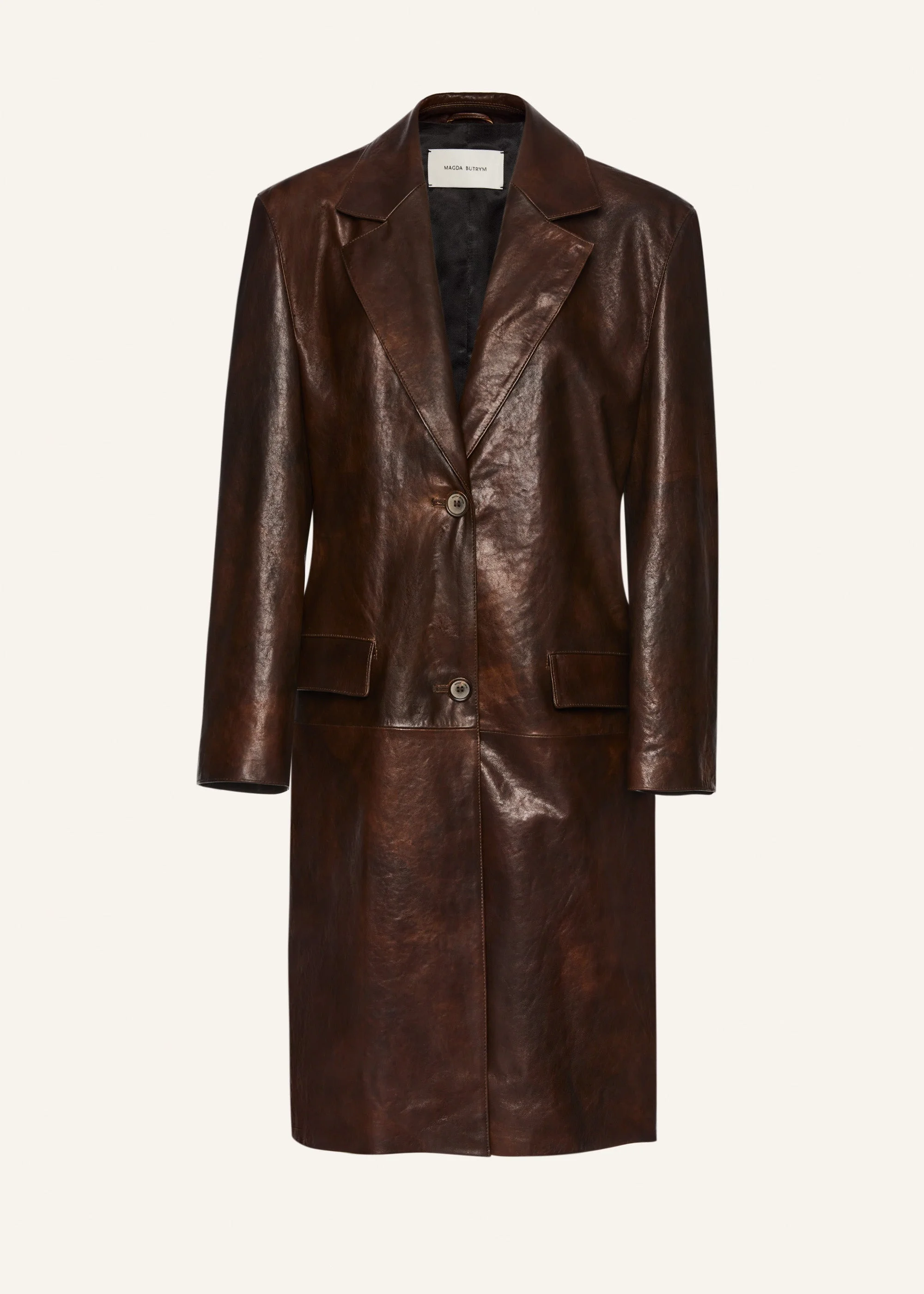 A classic oversized leather coat with a single breasted closure and classic lapels, hitting at the thigh. Details ID: 115725 Shell 100% Sheep Leather. Lining 100% Viscose. Sizing This piece fits true to size. We recommend you get your regular size. Model is 180 cm and is wearing a size 34.