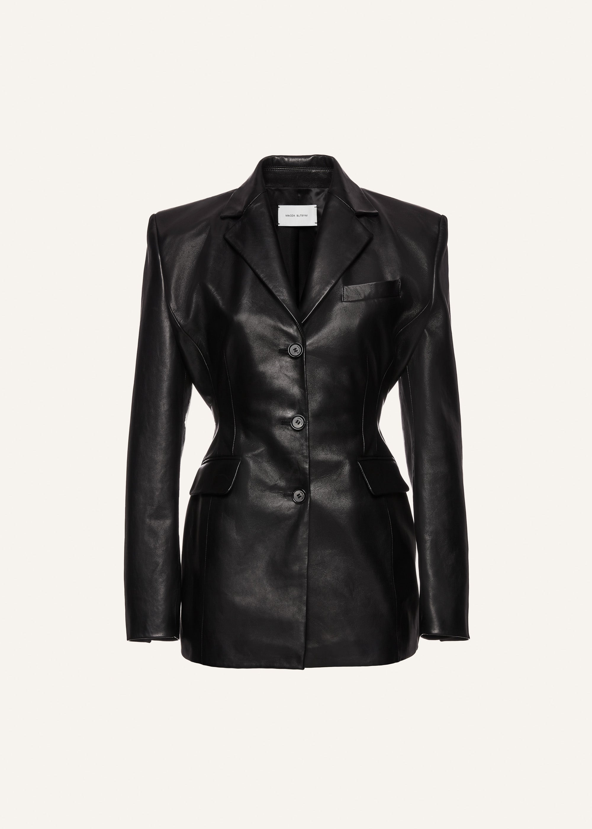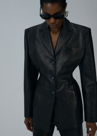 Our best-selling hourglass shape returns this season in leather, with shoulder pads, a cinched waist which is further defined by an adjustable belt, and longer length. Details ID: 101721 Shell 100% Sheep Leather. Lining 100% Viscose. Sizing This piece fits true to size. We recommend you get your regular size. Model is 179cm and is wearing a size 34.