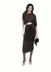 A sculptural sleeveless blouse crafted from a soft cupro blend with added stretch. The design features a rounded neckline, voluminous draping gathered at the top and hem, and a smooth inner lining that balances its airy structure. Light shoulder padding adds definition to the silhouette, while the elasticated hem creates a subtle bubble effect. Fastens at the back with three covered buttons and loop closures. Details ID: 287426 Shell 92% Cupro 8% Elastane. Sizing This piece has a regular fit. Model is wearing a size 34.