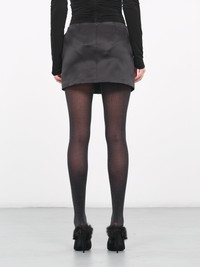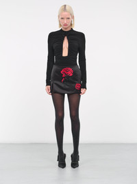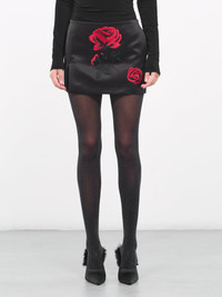 MAGDA BUTRYM skirt in black, silk and wool construction, low-rise, flower embroidery motif, side split-hem, fully lined, mini length, slim fit. Made in Poland Outer: 74% Silk 26% Wool Lining: 100% Silk European Sizing Model is 5'9" wearing size 36. Bust: 32" Waist: 24" Hips: 34"