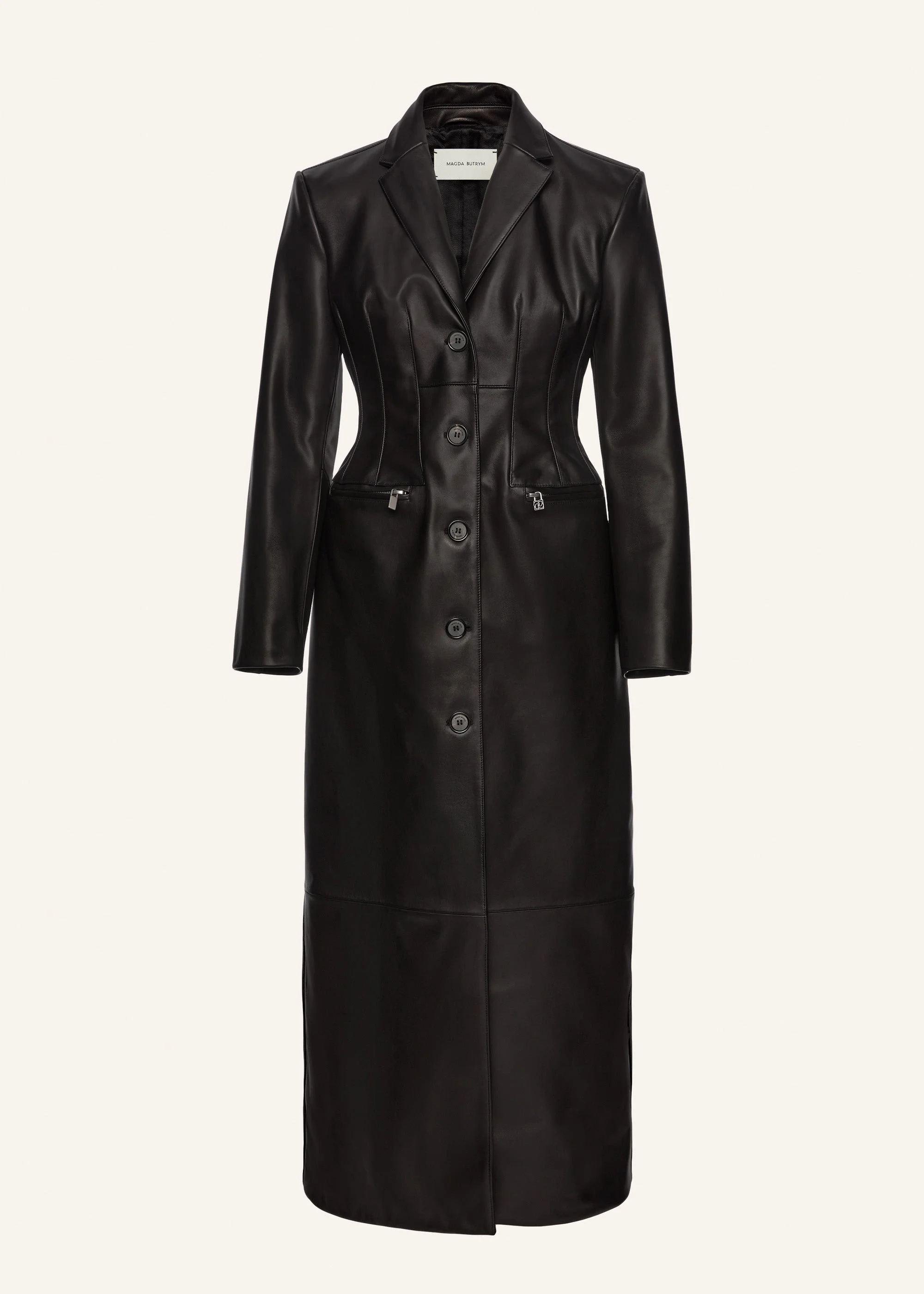 Corset stitch detailing at the waist gives a feminine finish to a classic leather coat. Details ID: 172725 Shell 100% Sheep Leather. Lining 100% Viscose. Sizing This piece fits true to size. We recommend you get your regular size. Model is 180 cm and is wearing a size 34.
