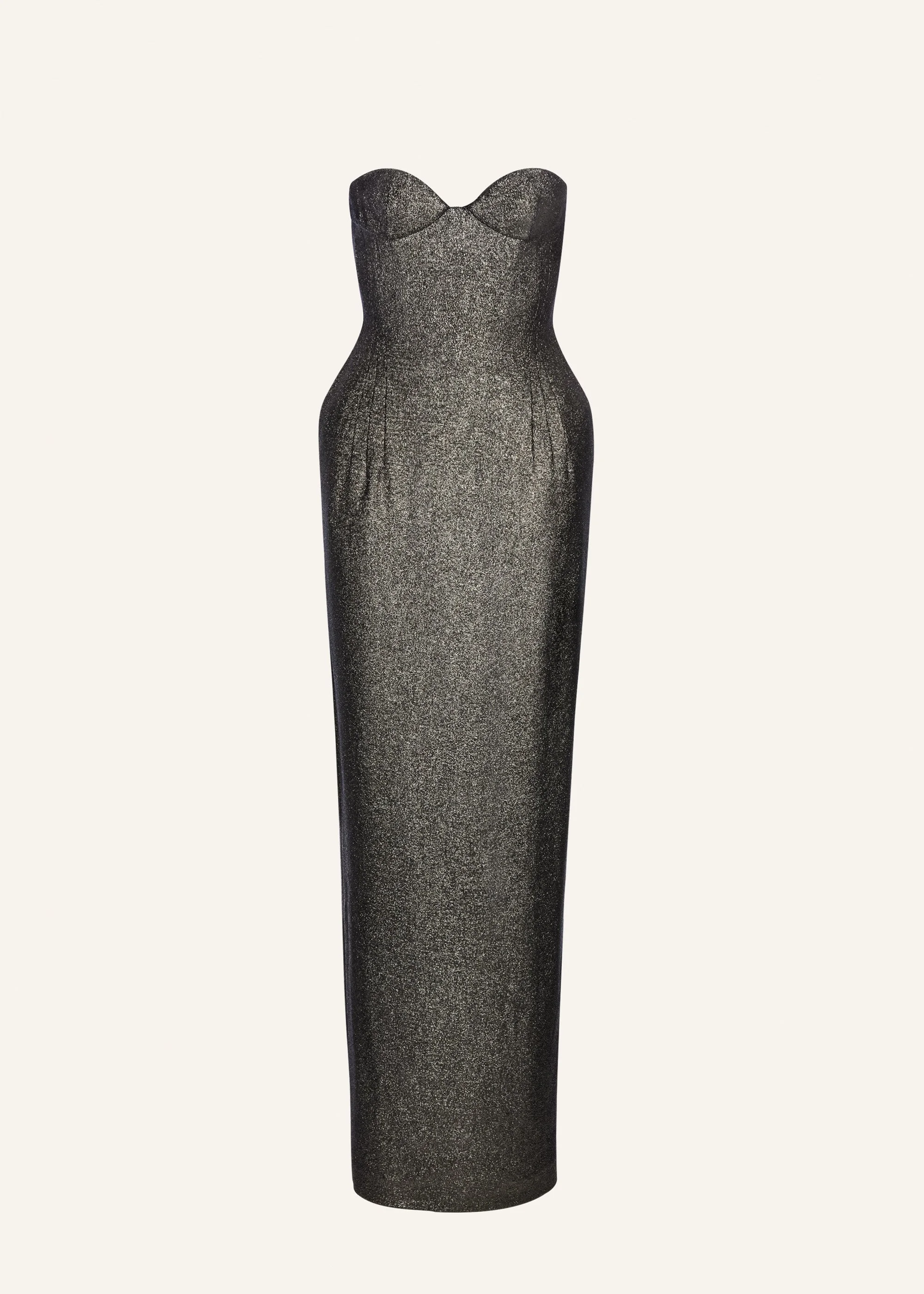 This sculptural strapless midi dress is cut close to the body with exaggerated padded hips that create a dramatic hourglass silhouette. Made from shimmering graphite, the fitted shape is finished with a sweetheart neckline and back slit for movement. Details ID: 182925 Shell 86% Viscose 13% Polyamide 1% Elastane Lining 90% Silk 10% Elastane Sizing This piece fits true to size. We recommend you get your regular size. Model is 177 cm and is wearing a size 34.