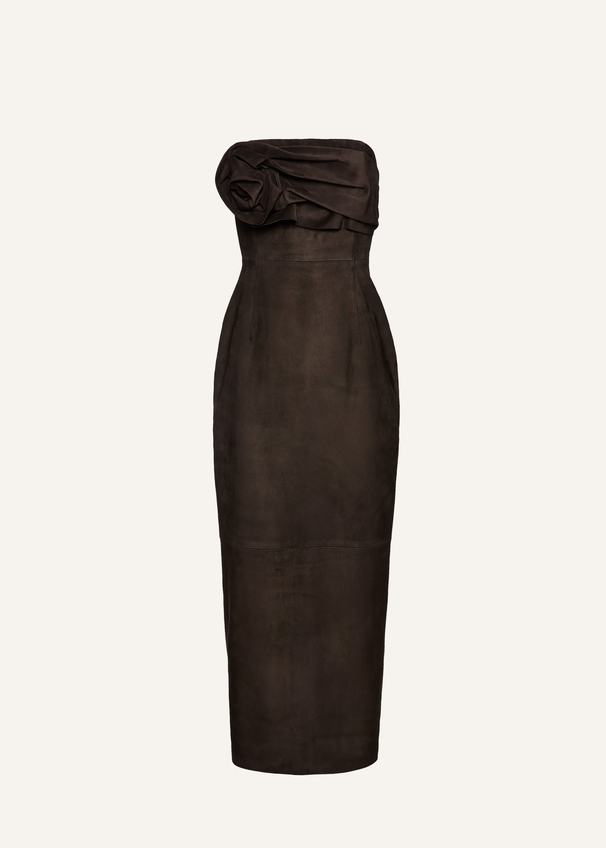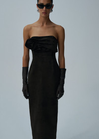This elegant strapless dress features a beautifully ruched bodice that creates a sculptural, rose-like accent. The fitted silhouette hugs the body, offering a sophisticated and flattering shape Details ID: 402525 Shell 100% Sheep Leather.