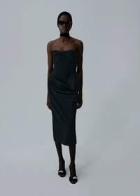 This mid-length corset dress features a structured bodice with intricate darting and sculptural draping across the bust and hip. Designed to accentuate the figure, the silhouette is enhanced with padded hips for subtle volume. The back slit ensures movement, while a hidden zip closure and full lining complete this refined piece. Details ID: 241925 Shell 78% Viscose 17% Polyamide 5% Elastane. Lining 90% Silk 10% Elastane. Sizing This piece fits true to size. We recommend you get your regular size. Model is 177 cm and is wearing a size 34.