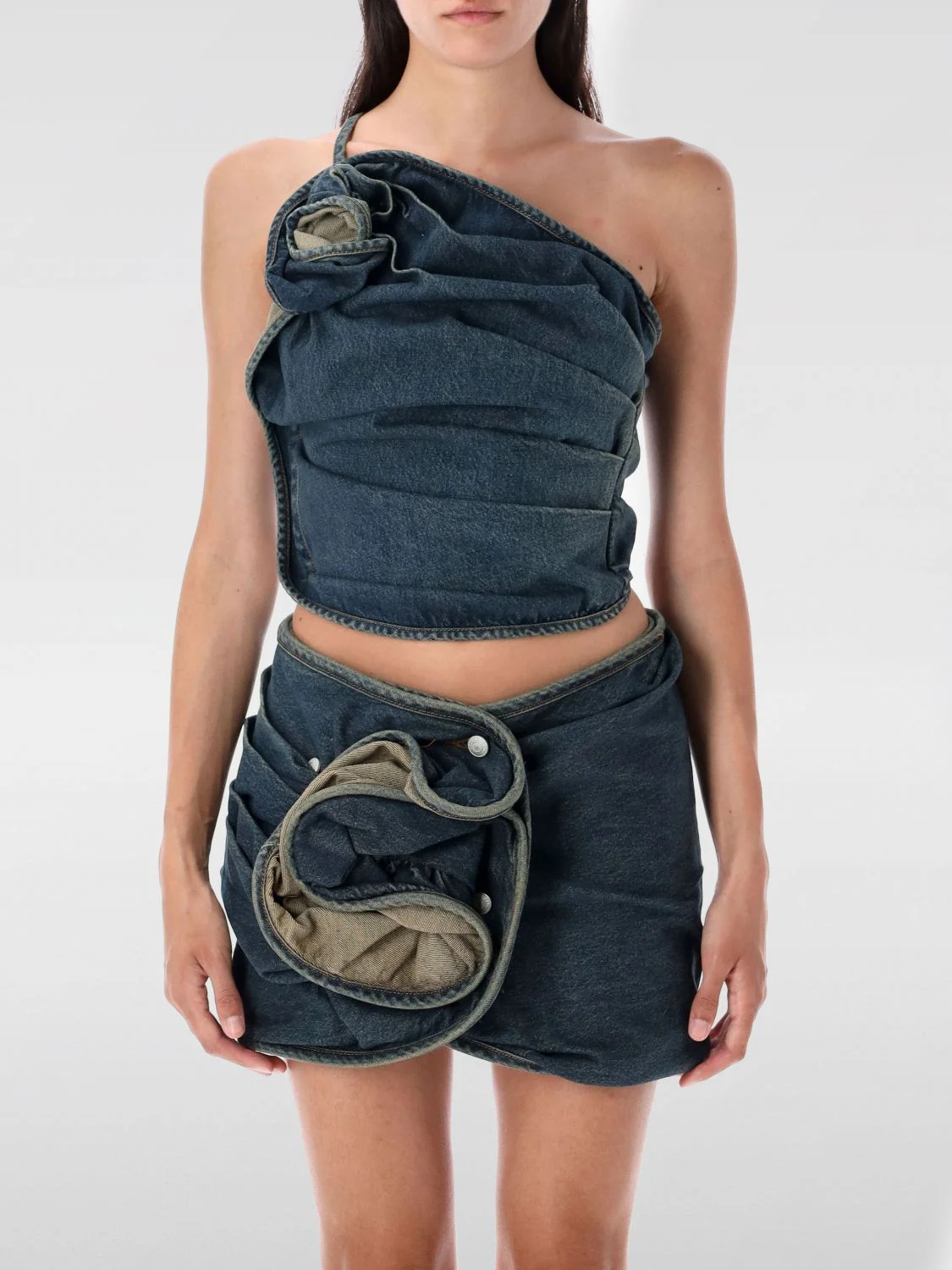 DESCRIPTION - Style: Urban-street - Neckline: Asymmetric - Shoulders: Regular - Closure: Side closure with buttons - Bottom: With straight hemline - Details: With flower - Model: Curled - Sleeves: Off-the-shoulder tops - Materials: Cotton denim - Pattern: undefined DETAILS AND CARE Composition 100% cotton SIZE AND FIT Sizes not available Size and fit Slim fit Designer code: 303725 VNTG BLUE Giglio Code: H32716 Designer: Magda Butrym Collection: Magda Butrym Woman Category: Clothing Magda Butrym
