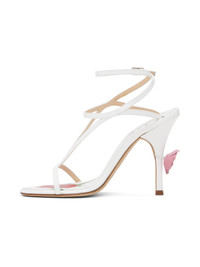 Patent calfskin heeled sandals in white. · Open toe · Straps at vamp · Wraparound pin-buckle ankle strap · Logo and graphic printed at calfskin footbed · Floral applique at heel · Covered stiletto heel with rubber injection · Nubuck sole · Heel: H4.25" Supplier color: White Upper: calfskin. Sole: calfskin, rubber. Made in Italy 242533F125003