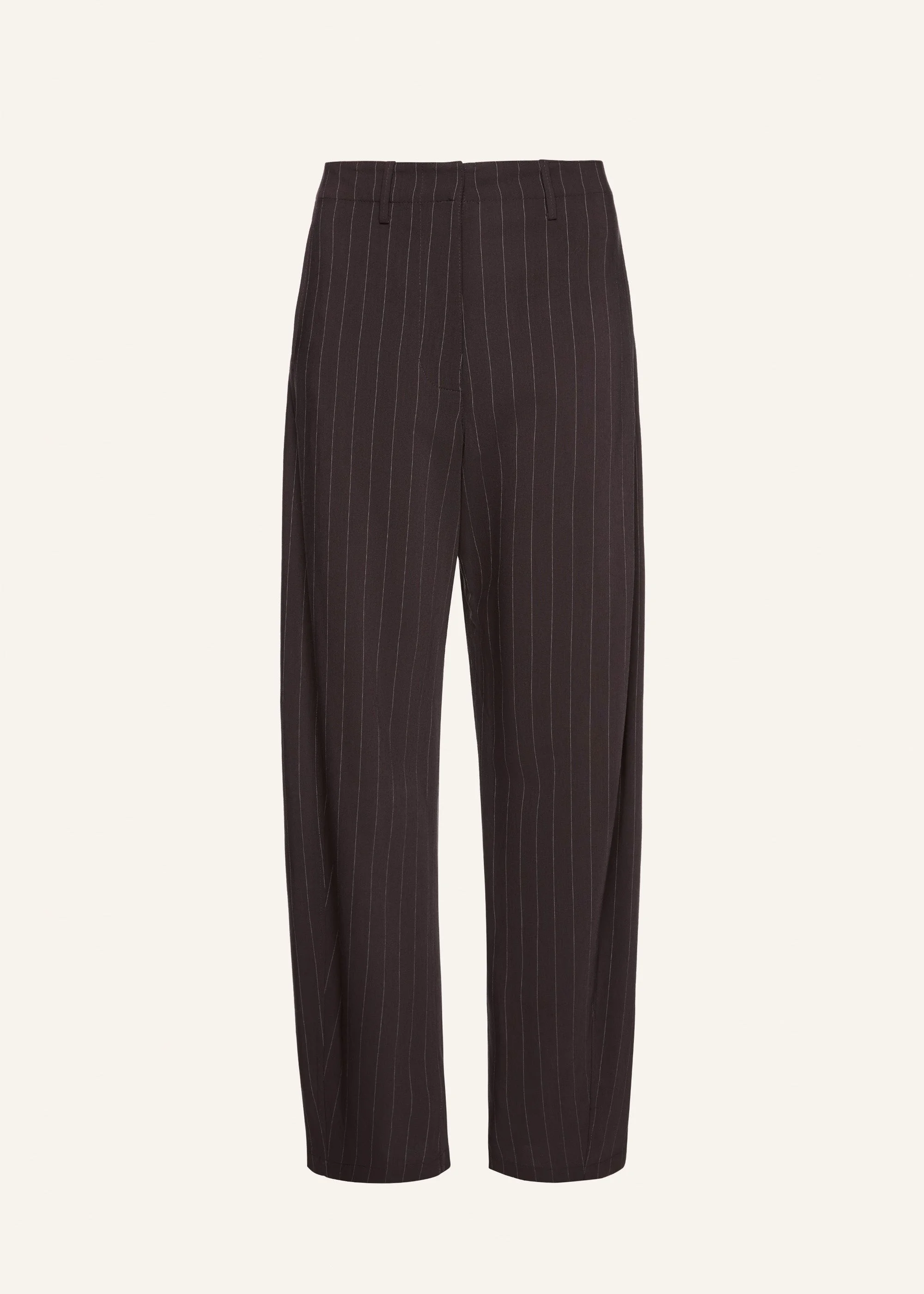 These tailored trousers feature a wide-leg silhouette with side seams shifted toward the front, creating a refined shape. Designed with front welt pockets and single-button back pockets, they have a dropped waistline. The rear belt loops are shaped into an "M" motif for a signature finish. Details ID: 216925 Shell 97% Wool 3% Polyamide. Lining 100% Silk. Sizing This piece fits true to size. We recommend you get your regular size. Model is 177 cm and is wearing a size 34.