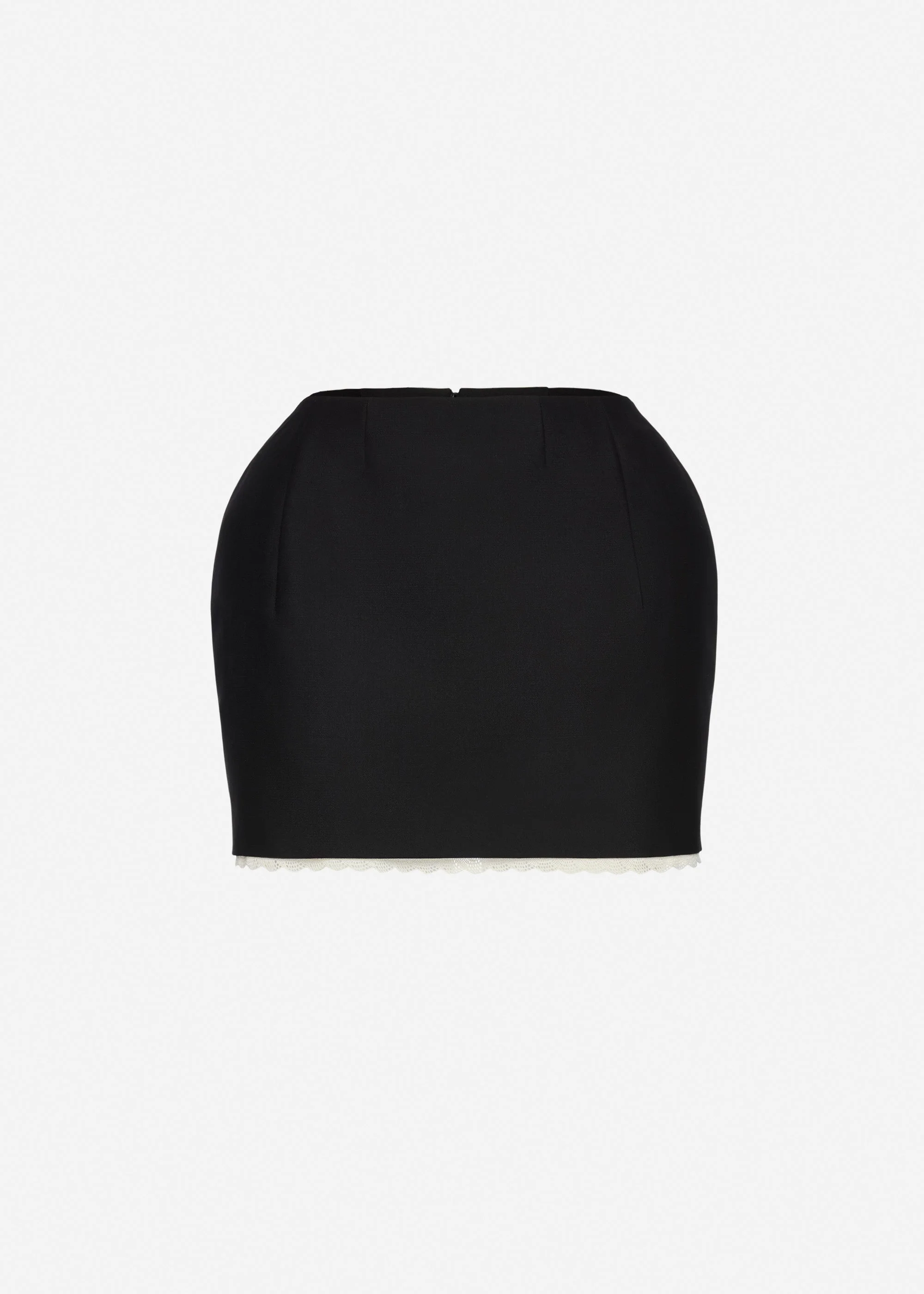 A structured wool mini skirt with softly accentuated hips supported by internal padding. Designed with a clean waistline, and a delicate lace trim along the hem for a feminine touch. The skirt fastens at the center back with a concealed zipper and an inner button-and-loop closure. Details ID: 218426 Shell 59% Wool 41% Mohair. Lining 100% Silk. Sizing This piece has a slim fit. Model is wearing a size 34.