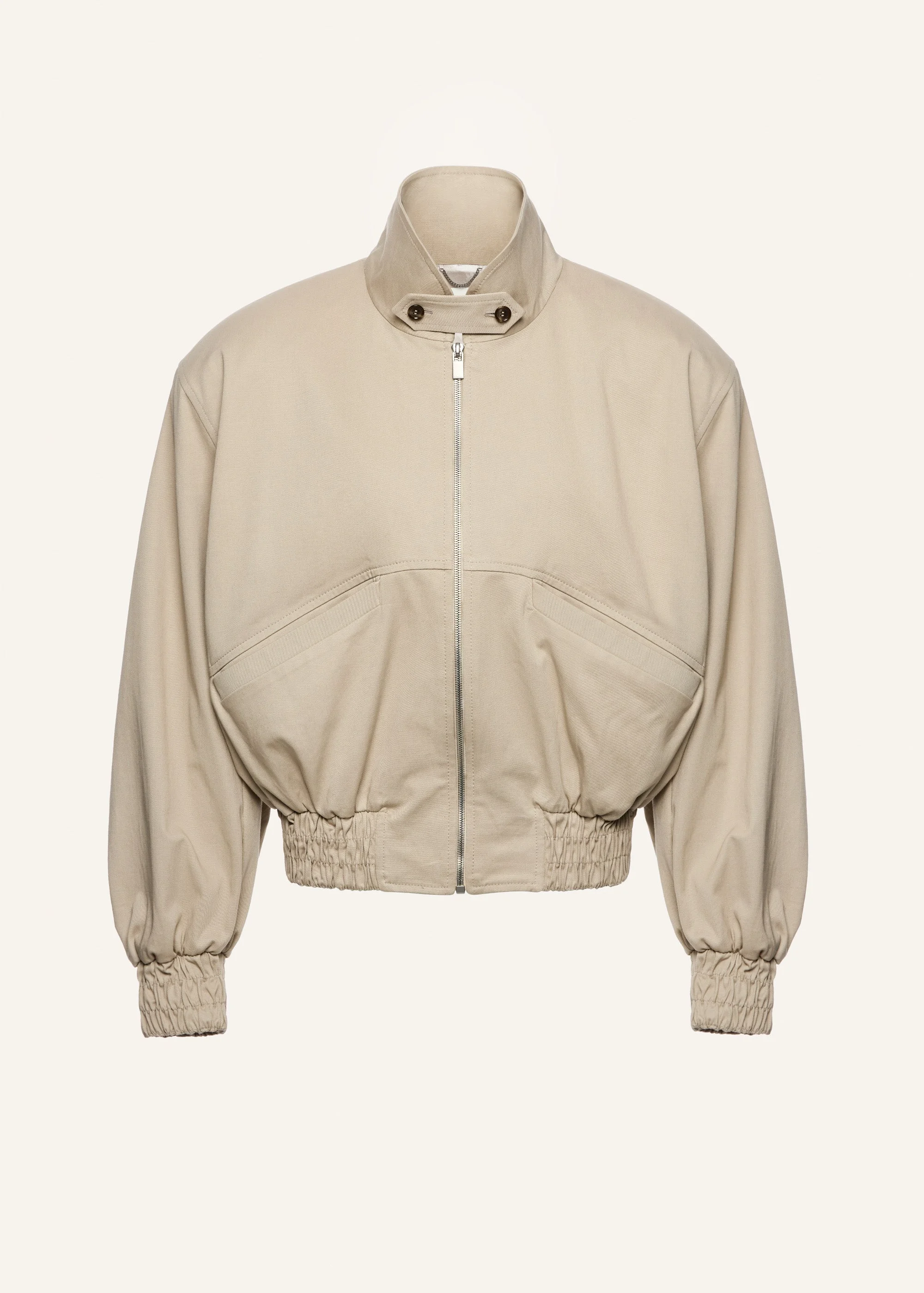 A cropped bomber jacket, featuring a high stand collar with tab closure and detachable shoulder pads. Designed with slanted front pockets cut along the seam, elasticated cuffs and hem, and subtle logo embroidery at the back. Finished with a front zip closure for an effortlessly structured look. Details ID: 117925 Shell 97% Wool 3% Silk. Lining 100% Silk. Sizing This piece fits true to size. We recommend you get your regular size. Model is 177 cm and is wearing a size 34.