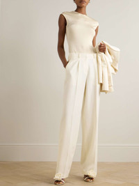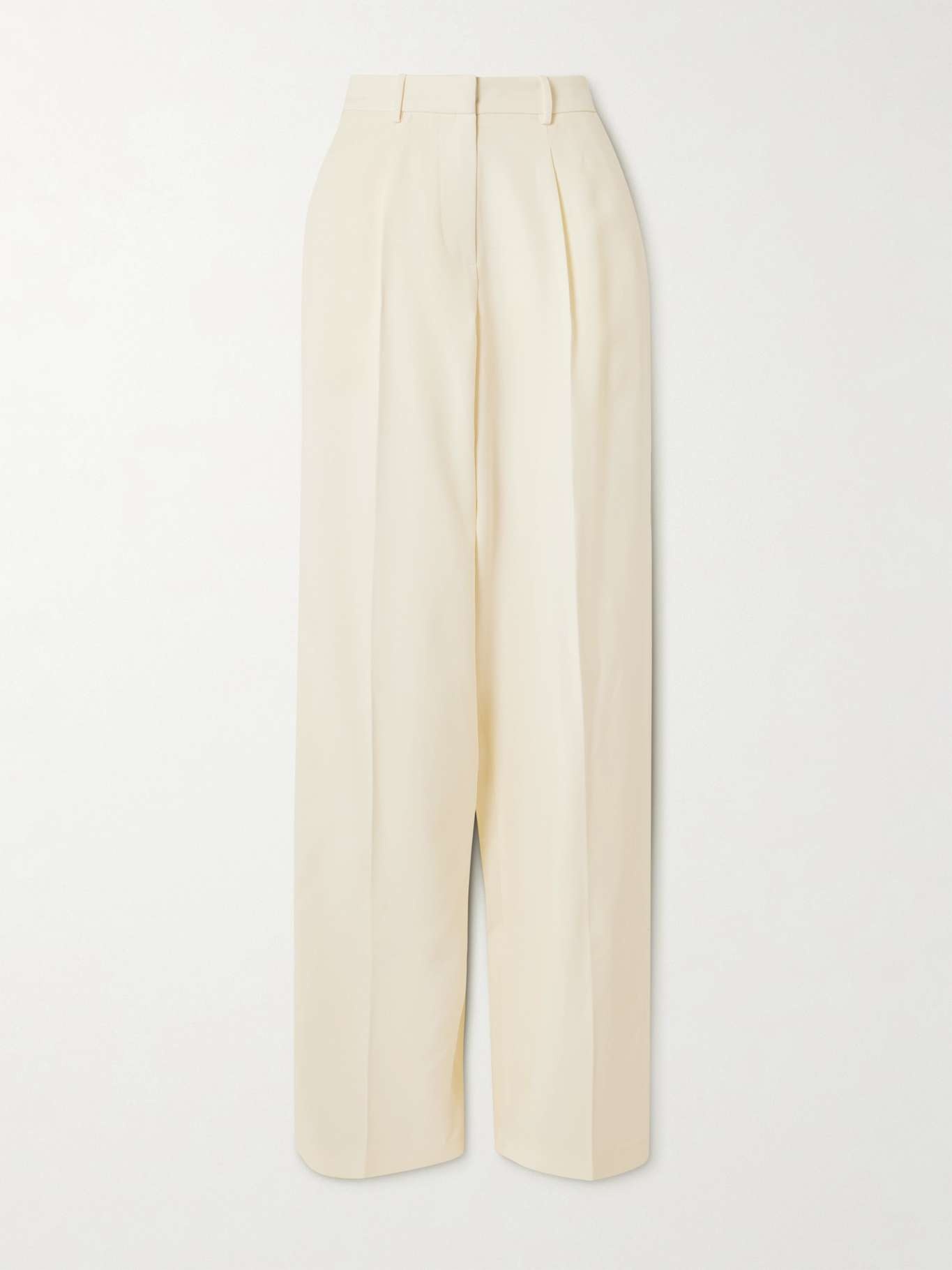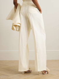 EDITORS'NOTES Magda Butrym's pants effortlessly master a sophisticated dress code. Tailored from wool and silk-blend cady, each pooling straight leg is highlighted by defined pleats. The high-waisted profile means you can tuck in tanks or blouses too. SIZE & FIT Model measurements: - Fits true to size, take your normal size - High-rise, designed for a straight-leg fit - Particularly long in length - Mid-weight, non-stretchy fabric - Model is 180cm/ 5'11" and is wearing a FR 36 - Bust: 80cm/ 31.5" - Waist: 65cm/ 25.5" - Hip: 89cm/ 35" DETAILS & CARE - Cream wool and silk-blend cady - Concealed button, hook and zip fastening at front - 70% wool, 30% silk; lining: 100% silk - Dry clean