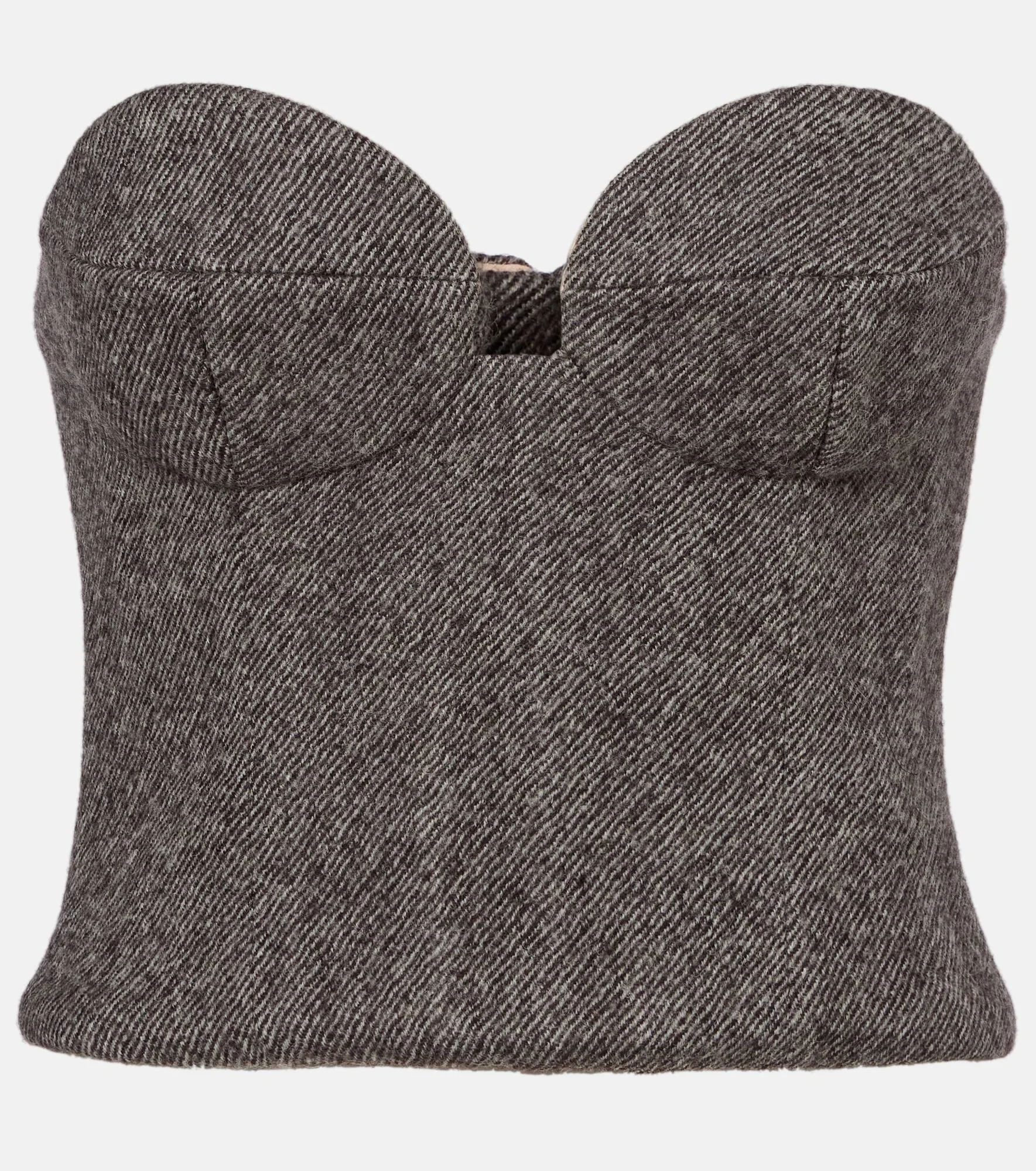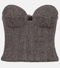 This Magda Butrym corset shapes a sculptural silhouette with structured boning and wired cups. Crafted from a wool blend, the strapless piece is completed with a soft silk lining. Product Details - Material: 97% wool, 3% polyamide - Care instructions: dry clean - Made in Poland - Designer color name: Grey - Item color: gray - Lining: 100% silk - Boning - Underwired cups - Closure: hook-fastening back - Item number: P01086713 Size & Fit - Fits large to size - we recommend trying one size smaller - Ideal fit for larger bust sizes - Strapless - Internal boned corset for support - Cinched waist - Non-stretchy fabric - Slightly cropped - The model seen in the picture is 178cm-5'10" and wearing a size FR 34