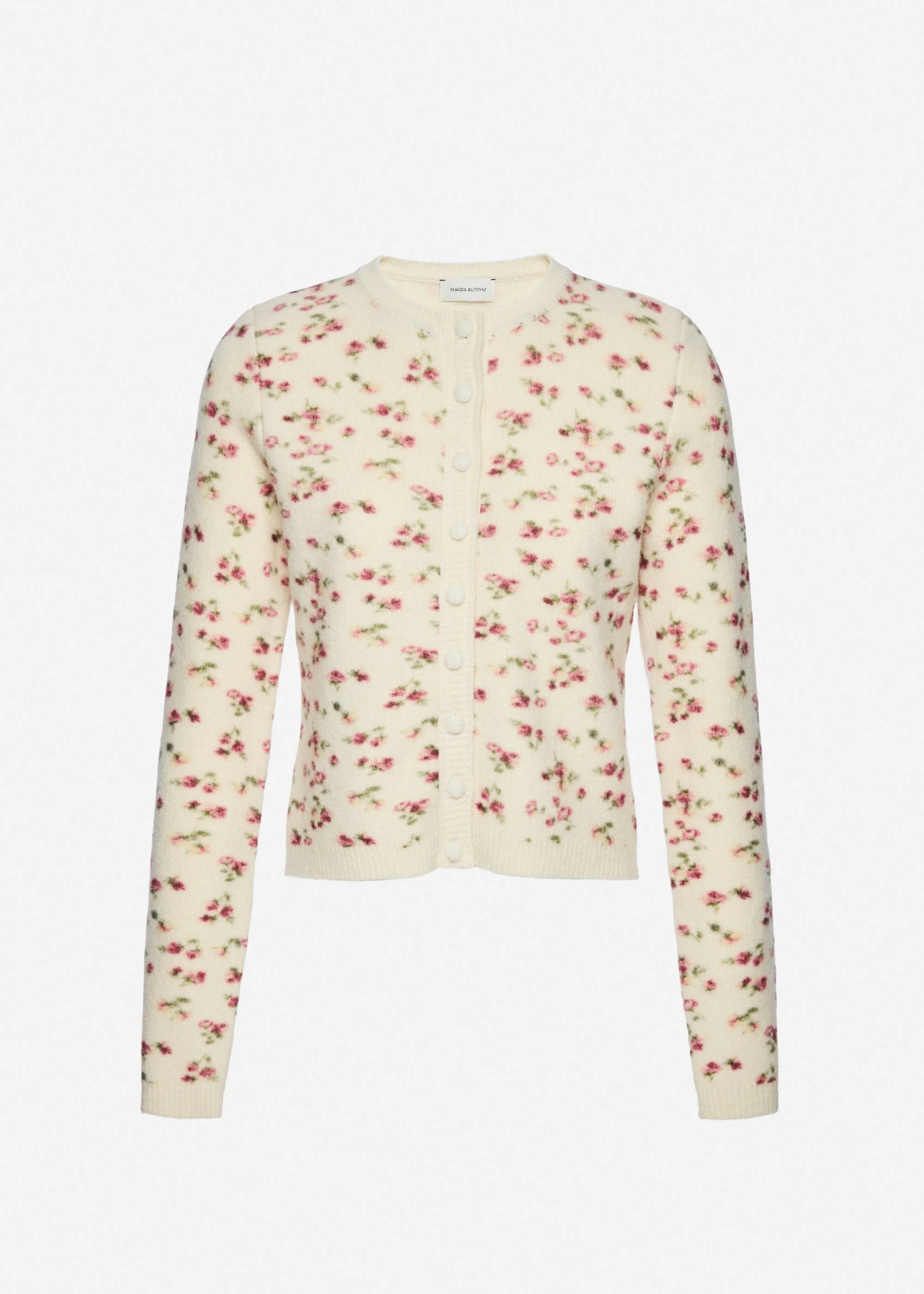 Classic wool, silk and cashmere cardigan adorned with an all-over pink floral print. Features a round neckline and tonal covered buttons along the front. A soft, feminine piece that can be worn alone or paired with the matching floral top and shorts for a coordinated knitwear look. Details ID: 345426 Shell 50% Wool 30% Silk 20% Cashmere Sizing This piece has a regular fit. Model is wearing a size 34.