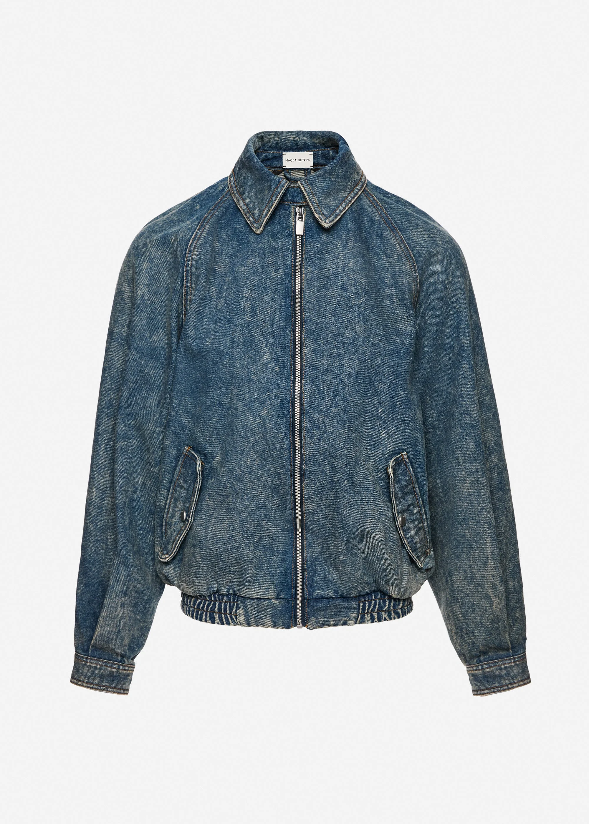 A zip-up denim jacket defined by a relaxed, rounded silhouette. The design features a classic collar and raglan sleeves, creating a soft, fluid line through the shoulders. Slanted pockets sit at the front, while an elasticated hem subtly shapes the volume. Finished with a front zip fastening and washed denim texture. Details ID: 200526 Shell 100% Cotton Sizing This piece has a regular fit. Model is wearing a size 34.