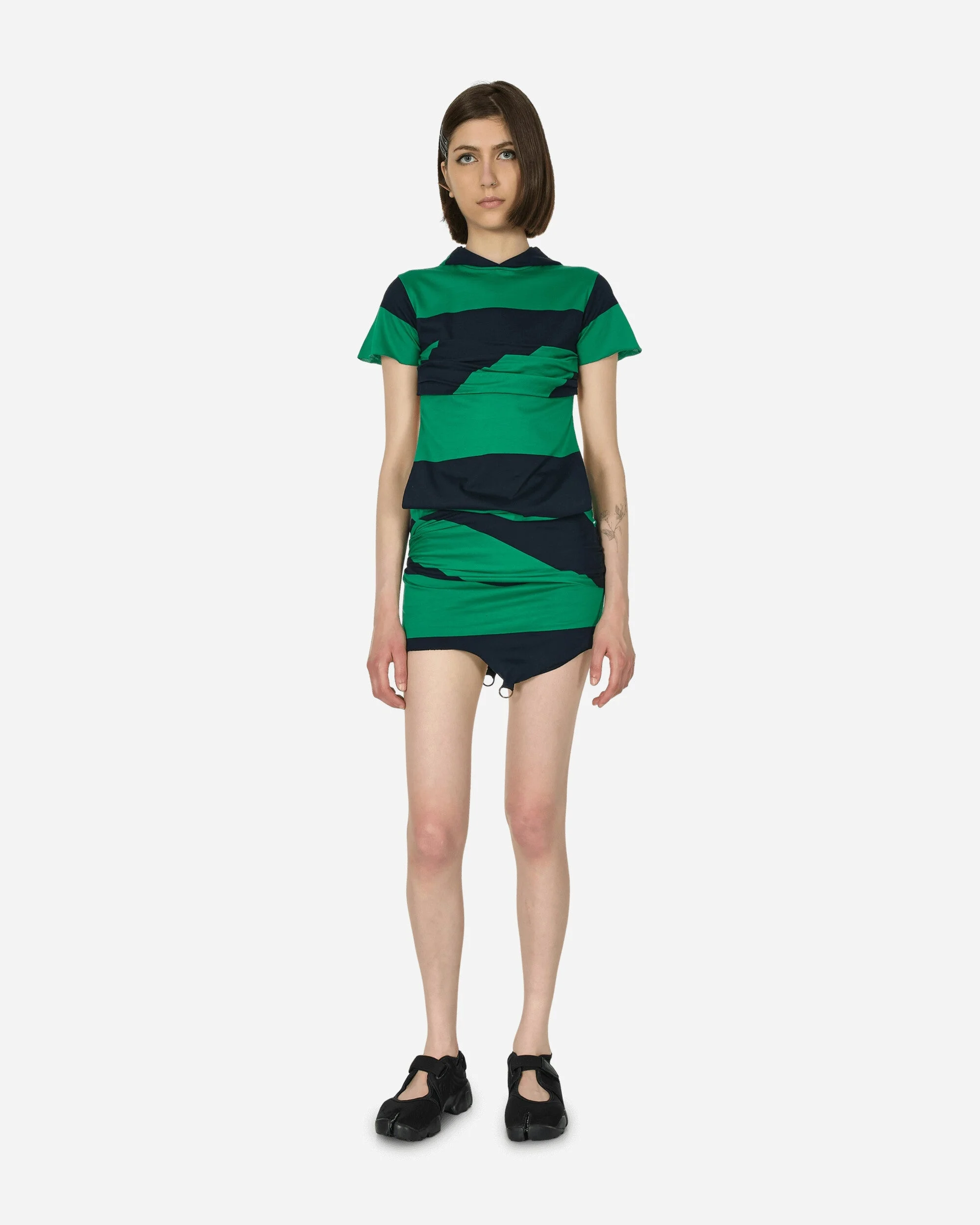 Mainline:RUS/Fr.CA/DE Charlie Dress Green / Navy Mainline:RUS/Fr.CA/DE was founded in 2019 by London-based duo Zarina Bekerova & Alexandra Vincent. The main focus of the brand is to forge a visual language that reconciles and articulates instances of fluid placelessness while exploring societal juxtapositions of comfort and sexiness. - 100% Cotton - Slim Fit - Striped Pattern - Fixed Hood - Raw Hem - Style Code: SS24CHARLIE 001 SIZE & FIT Model is 5ft 9in/1.79m with 31"/80cm chest and wears size S.