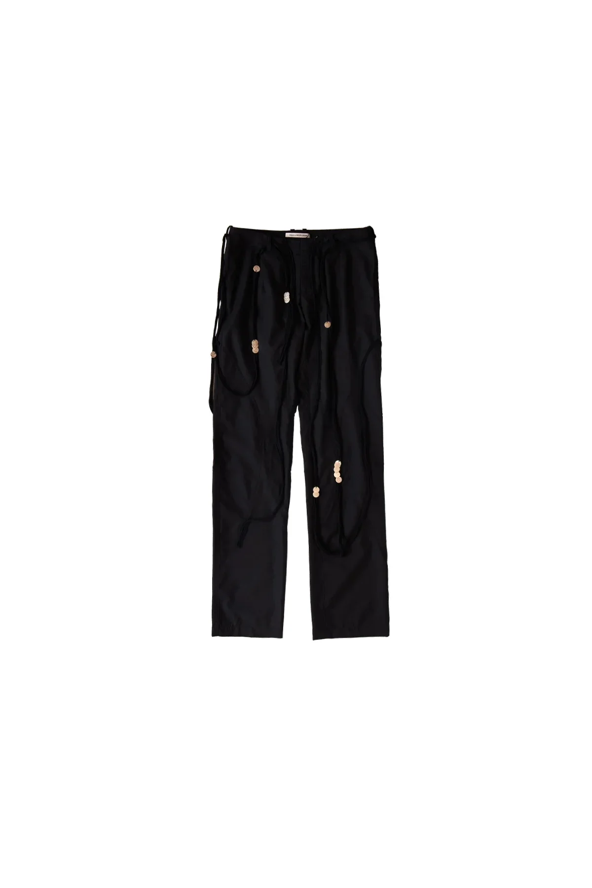 The Mainline Shaye Pants in twill featuring a classic straight-leg silhouette and paneled construction with an attached gold coin embellished cord for alternate styling. DETAILS - Twill fabrication - Classic straight-leg - Side pockets - Belt loops - Removable embellished rope Sizing: - True to size Material: Cotton Made in United Kingdom Product codes: - SKU: ESSX/MNL/SS25/SHAYE/Black/28 - UPC: 1403558050821