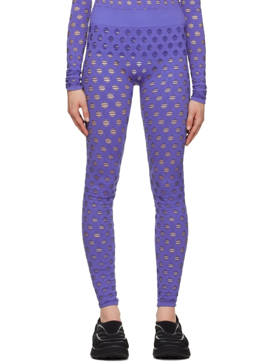 Semi-sheer stretch nylon jersey leggings. · Perforated detailing throughout · Rib knit elasticized waistband Supplier color: Midnight 91% nylon, 9% spandex. Made in United States 222370F085005