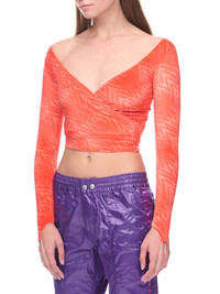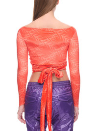 Maisie Wilen top in orange, soft velour, wrap top, v-neck, long sleeves with elastic finger loop, fitted. Made in USA One Size Composition: 71% Cotton, 29% Polyester Model is 5'11" and is wearing size XS. Bust: 32” Waist: 24” Hip: 35"