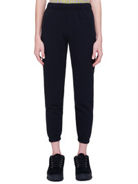 Maisie Wilen hypernormalisation joggers in black, elastic waistband, front printed text graphic, ribbed elastic cuffs, straight/finished hem, tonal stitching. Made in the United States. Standard S-L Sizing. Composition - 100% Cotton. Model Measurements: Model is 5ft 8” and wearing a size S. Bust: 32” Waist: 24” Hip: 34"
