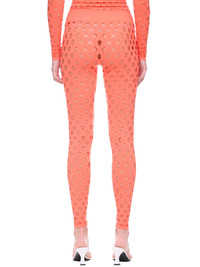 Maisie Wilen leggings in orange, perforated seamless knit, band waistband, fitted. Made in USA One Size Composition: 91% Nylon, 9% Spandex Model is 5'11" and is wearing size OS. Bust: 32” Waist: 24” Hip: 35"