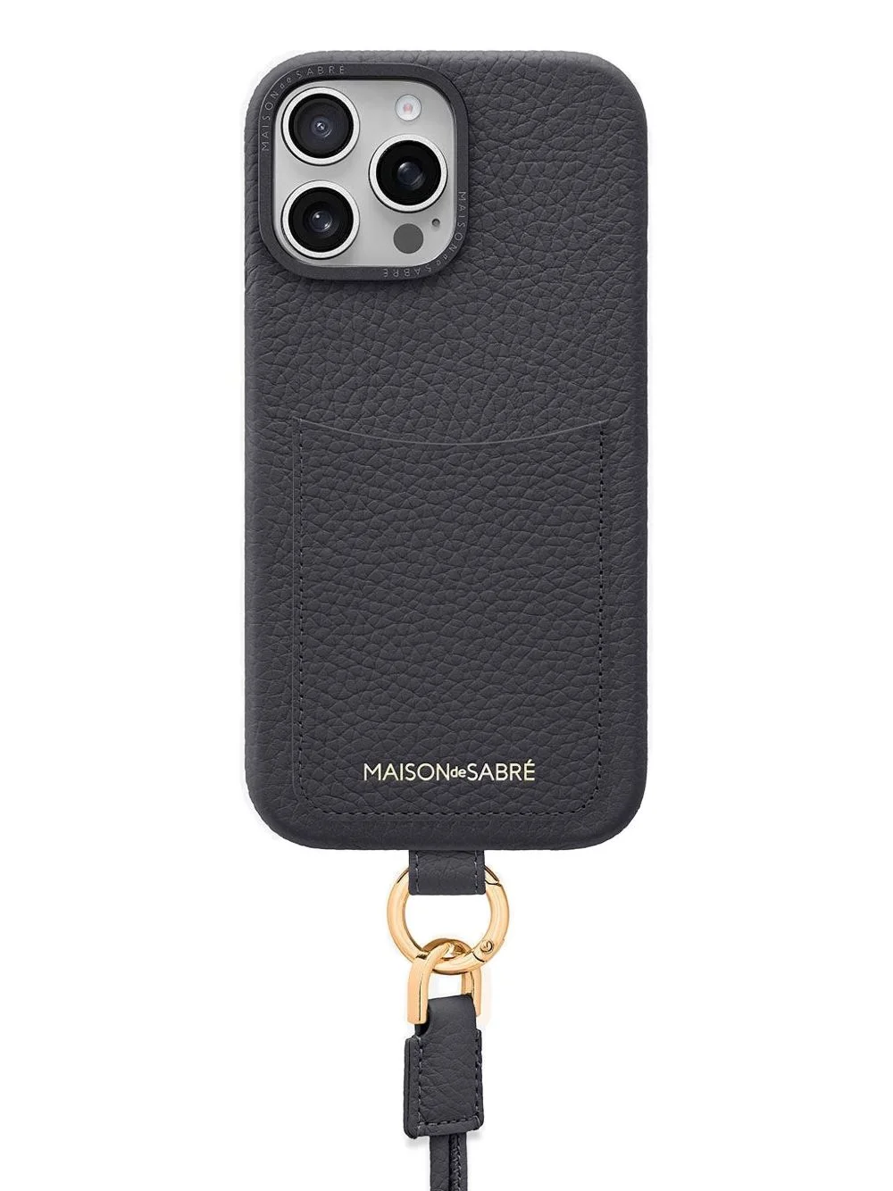 iPhone 16 Pro Max card slot leather phone case Highlights - Graphite grey - Leather rope attachment - Rear card slot - Aluminium camera guard - Gold-tone hardware - Full-grain leather Imported Composition Leather 100%, Aluminium 100%