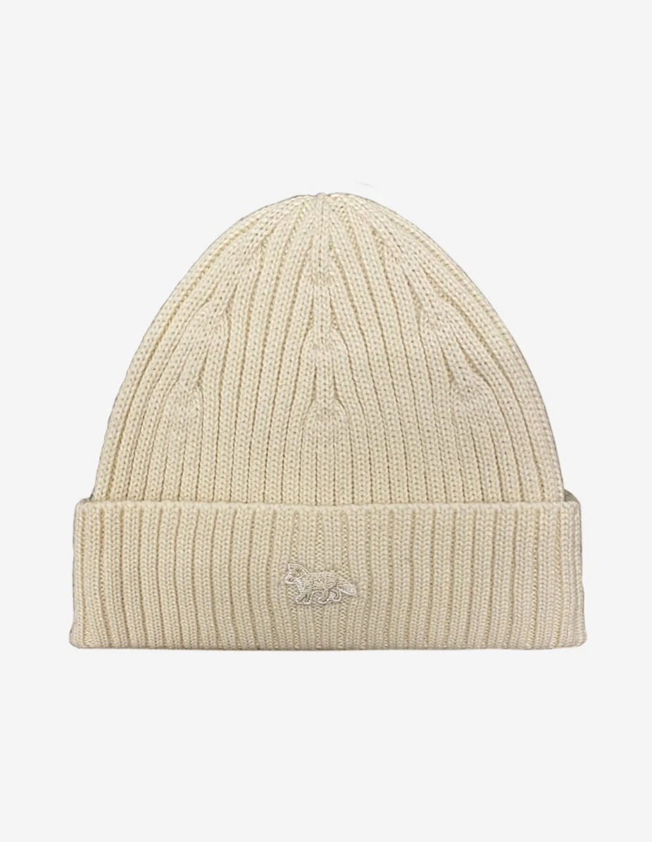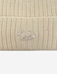 DETAILS Virgin wool beanie with embroidered Tonal Baby Fox patch on the turn-up. - Virgin wool beanie - Embroidered Tonal Baby Fox patch on the cuff PW06102KT1022-P103 SIZE & CUT Sizing: UNISEX MATERIAL 100% WOOL TRACEABILITY Made in Morocco