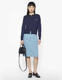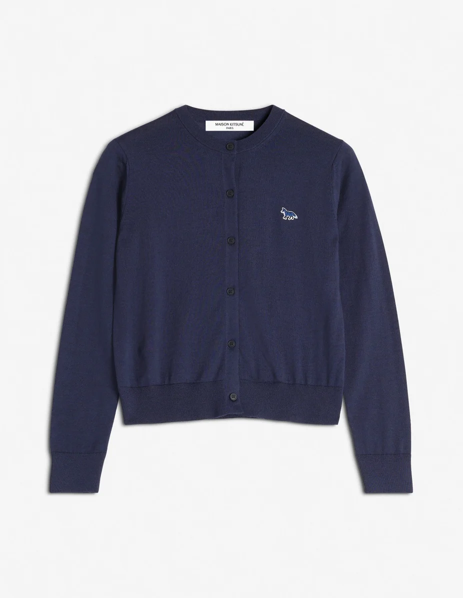 DETAILS Fine merino wool cardigan. Regular cut with embroidered Baby Fox patch. - Fine merino wool cardigan - Regular cut - Crewneck - Tone-on-tone Baby Fox patch embroidered on the chest - Engraved button closure - Long sleeves - Ribbing at the neckline, cuffs, and waist MW00507KT1036-P492 SIZE & CUT Cut: REGULAR Sizing: WOMEN The female model is 5 and is wearing size S MATERIAL 100% MERINO WOOL TRACEABILITY Made in Portugal