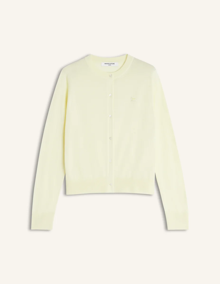 DETAILS Fine merino wool cardigan. Regular fit with Baby Fox embroidered patch on the chest. - Merino wool cardigan - Regular fit - Crewneck - Maison Kitsune engraved button closure - Tonal Baby Fox embroidered patch on the chest - Ribbing at the neckline, cuffs, and bottom MW00507KT1181-0424 SIZE & CUT Cut: REGULAR Sizing: WOMEN The female model is 5.7 tall and wears a size S MATERIAL 100% WOOL TRACEABILITY Made in Portugal