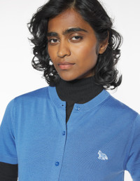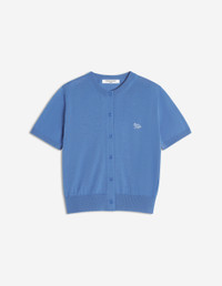 DETAILS Extra fine merino wool cardigan with short sleeves. Regular fit with Tonal Baby Fox embroidered patch. - Extra-fine merino wool cardigan - Regular fit - Maison Kitsune engraved button fastening - Short sleeves - Rib finishing at the neckline, sleeves and hem - Lightweight knit - Tonal Baby Fox embroidered patch on chest OW00513KT1181-0330 SIZE & CUT Cut: REGULAR Sizing: WOMEN The female model is 5.8 and is wearing size S MATERIAL 100% WOOL TRACEABILITY Made in Portugal