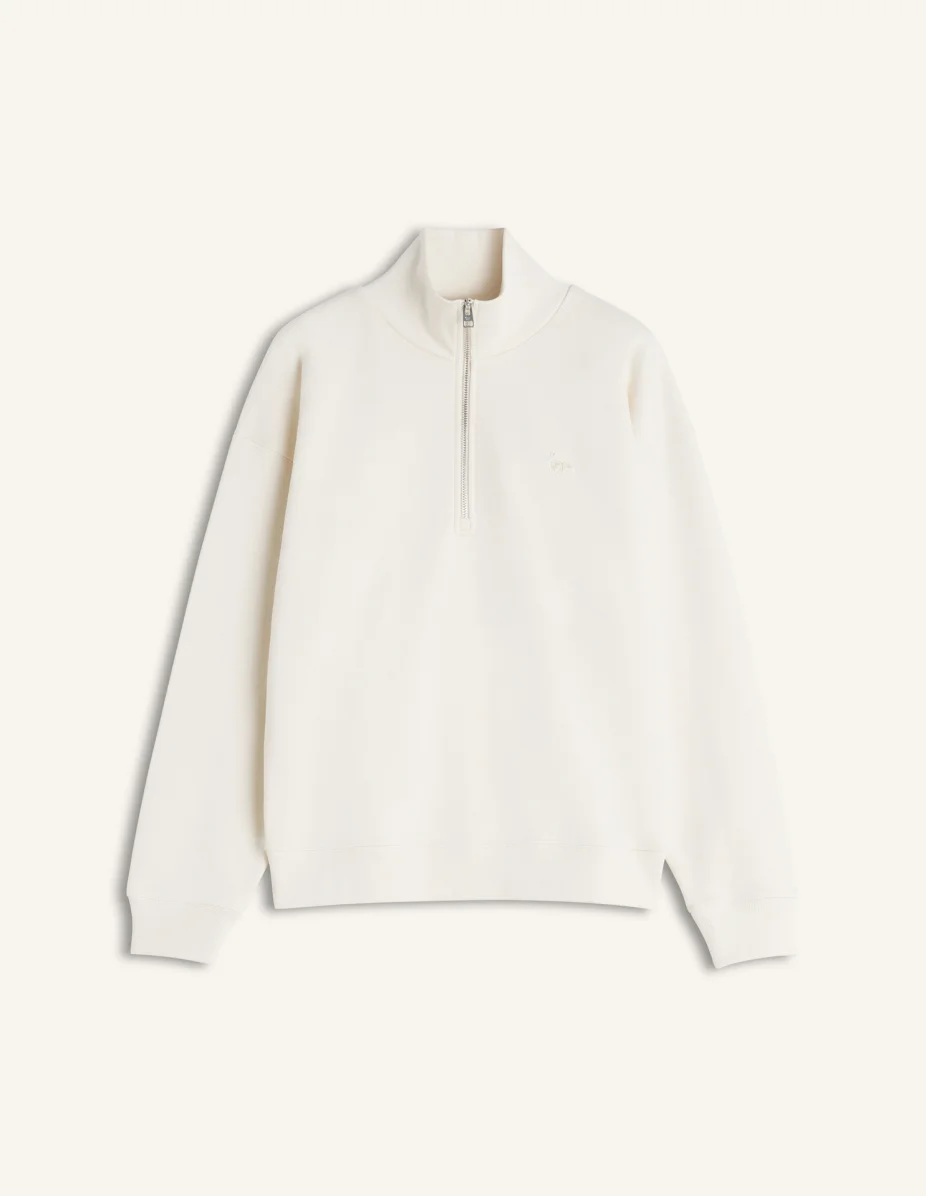 DETAILS Half zip sweatshirt in cotton casual fleece. Comfort fit with Baby Fox embroidered patch on the chest. - Half-zip sweatshirt in cotton casual fleece (440g) - Comfort fit - High neck - Half-zip closure with Profile Fox engraved zip puller - Tonal Baby Fox embroidered patch on the chest - Ribbing at the neckline, cuffs, and bottom MW00304KM0341-0063 SIZE & CUT Cut: COMFORT Sizing: WOMEN The female model is 5.8 tall and wears a size S MATERIAL Main Material: 100% ORGANIC COTTON, RIB: 2% ELASTANE, 98% ORGANIC COTTON TRACEABILITY Made in Portugal