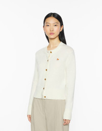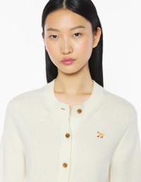DETAILS Lambswool cardigan. Fitted fit with embroidered Baby Fox patch. - Plain lambswool cardigan - Fitted fit - Maison Kitsune engraved button closure - Long sleeves - Rib finishing at the neckline, cuffs and hem - Embroidered Baby Fox patch on the chest PW00506KT1006-0383 SIZE & CUT Cut: FITTED Sizing: WOMEN The female model is 5.7 and is wearing size S MATERIAL 100% WOOL TRACEABILITY Made in Morocco