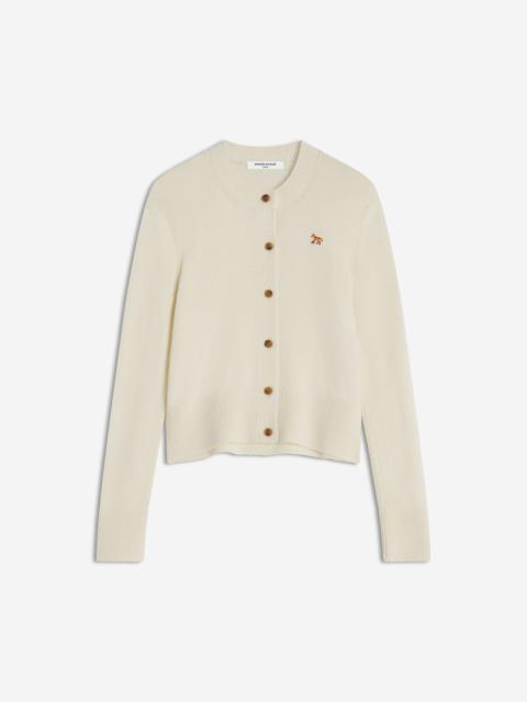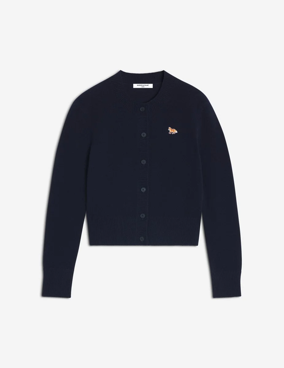 DETAILS Lambswool cardigan. Fitted fit with Baby Fox embroidered patch. - Plain lambswool cardigan - Fitted fit - Crew neck - Long sleeves - Maison Kitsune engraved button closure - Rib finishing at the neckline, cuffs and hem - Soft & hypoallergenic knit - Baby Fox embroidered patch on the chest PW00506KT1006-0413 SIZE & CUT Cut: FITTED Sizing: WOMEN MATERIAL 100% WOOL TRACEABILITY Made in Morocco