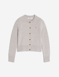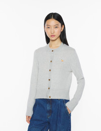 DETAILS Lambswool cardigan. Fitted fit with Baby Fox embroidered patch. - Plain lambswool cardigan - Fitted fit - Crew neck - Long sleeves - Maison Kitsune engraved button closure - Rib finishing at the neckline, cuffs and hem - Soft & hypoallergenic knit - Baby Fox embroidered patch on the chest PW00506KT1006-H120 SIZE & CUT Cut: FITTED Sizing: WOMEN The female model is 5.7 and is wearing size S MATERIAL 100% WOOL TRACEABILITY Made in Morocco