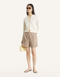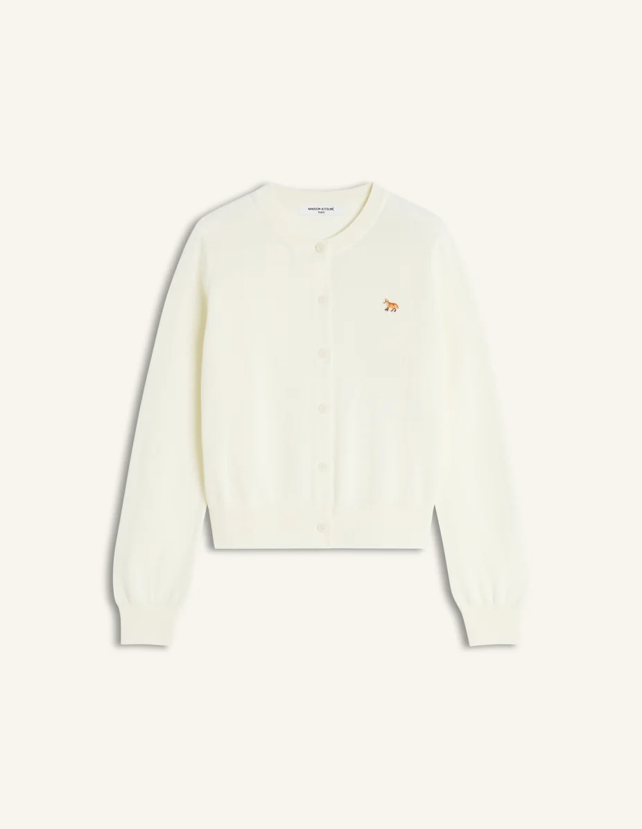 DETAILS Merino wool cardigan. Regular fit with Baby Fox embroidered patch on the chest. - Merino wool cardigan - Regular fit - Crew neck - Maison Kitsune engraved button closure - Baby Fox embroidered patch on the chest - Ribbing at the neckline, cuffs, and waist PW00502KT1181-0383 SIZE & CUT Cut: REGULAR Sizing: WOMEN The female model is 5.8 tall and wears a size S MATERIAL 100% WOOL TRACEABILITY Made in Portugal