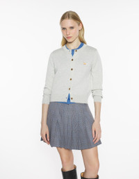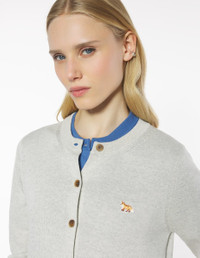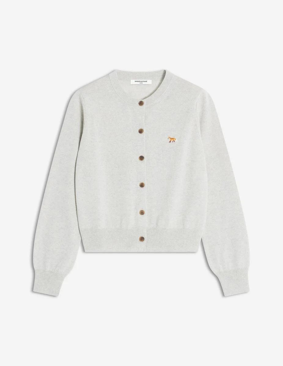 DETAILS Extra-fine merino wool cardigan. Regular fit with Baby Fox embroidered patch. - Extra fine plain merino wool cardigan - Regular fit - Crew neck - Long sleeves - Maison Kitsune engraved button closure - Rib finishing at the neckline, cuffs and hem - Baby Fox embroidered patch on the chest PW00502KT1181-H120 SIZE & CUT Cut: REGULAR Sizing: WOMEN The female model is 5.7 and is wearing size S MATERIAL 100% EXTRAFINE WOOL TRACEABILITY Made in Portugal