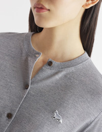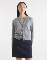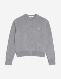 DETAILS Fine merino wool cardigan. Regular cut with embroidered Baby Fox patch. - Fine merino wool cardigan - Regular cut - Crewneck - Tone-on-tone Baby Fox patch embroidered on the chest - Engraved button closure - Long sleeves - Ribbing at the neckline, cuffs, and waist MW00507KT1036-H131 SIZE & CUT Cut: REGULAR Sizing: WOMEN The female model is 9.1 and is wearing size S MATERIAL 100% MERINO WOOL TRACEABILITY Made in Portugal