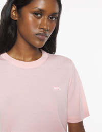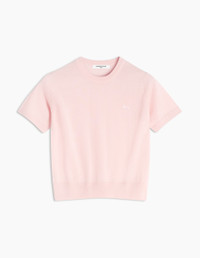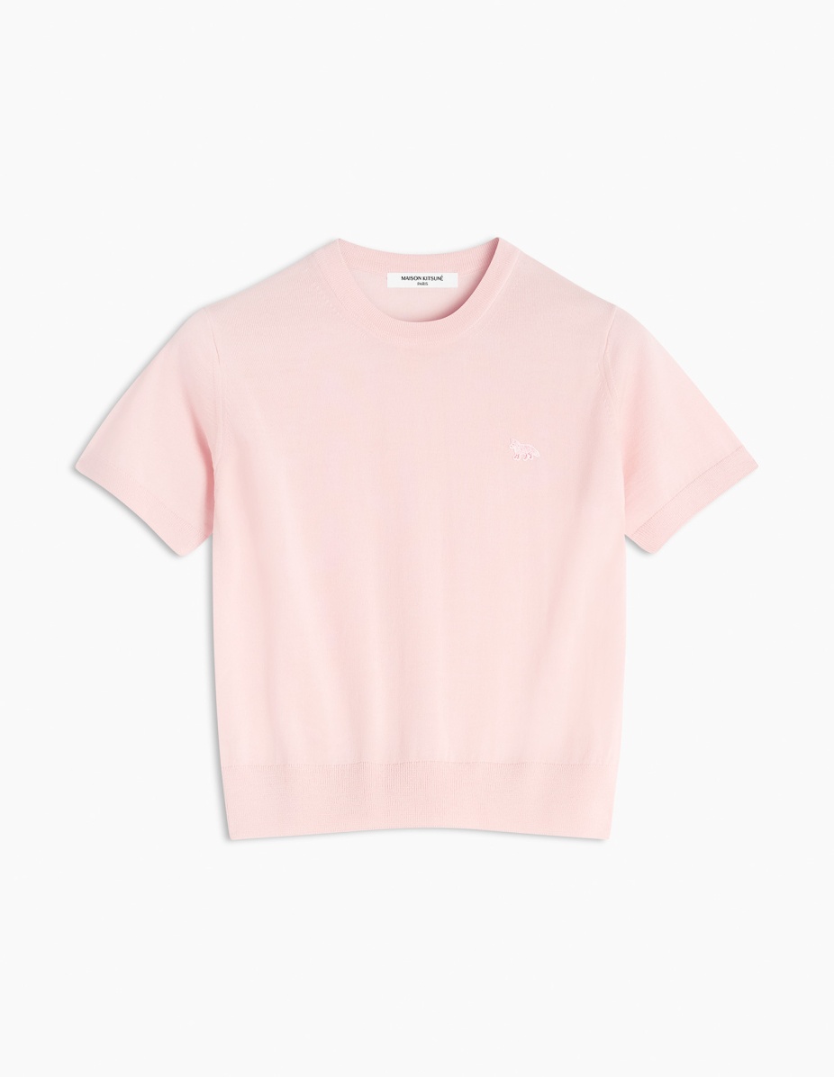 DETAILS Short sleeve merino wool jumper. Regular cut with embroidered Baby Fox patch. - Plain merino wool jumper - Regular cut - Crewneck - Tone-on-tone Baby Fox patch embroidered on the chest - Short sleeves - Ribbing at the neckline, cuffs, and waist OW00807KT1036-0140 SIZE & CUT Cut: REGULAR Sizing: WOMEN The female model is 9.1 and is wearing size S MATERIAL 100% WOOL TRACEABILITY Made in Portugal