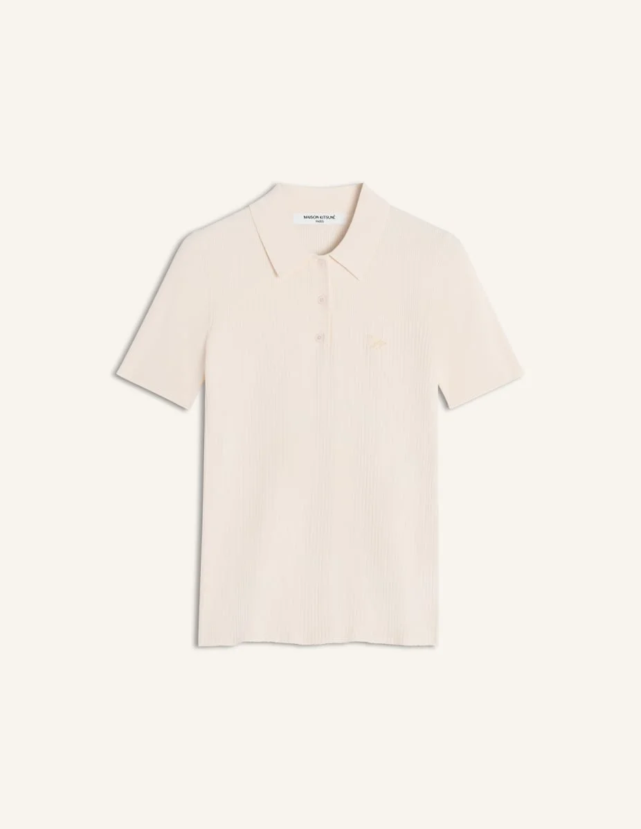 DETAILS Polo in pleated viscose rib. Fitted cut with Baby Fox embroidered patch on the chest. - Viscose pleated rib polo - Fitted cut - Button placket with Maison Kitsune engraved buttons - Tonal Baby Fox embroidered patch on the chest QW00202KT1193-0063 SIZE & CUT Cut: FITTED Sizing: WOMEN The female model is 5.7 tall and wears a size S MATERIAL 17% POLYESTER, 83% VISCOSE TRACEABILITY Made in China