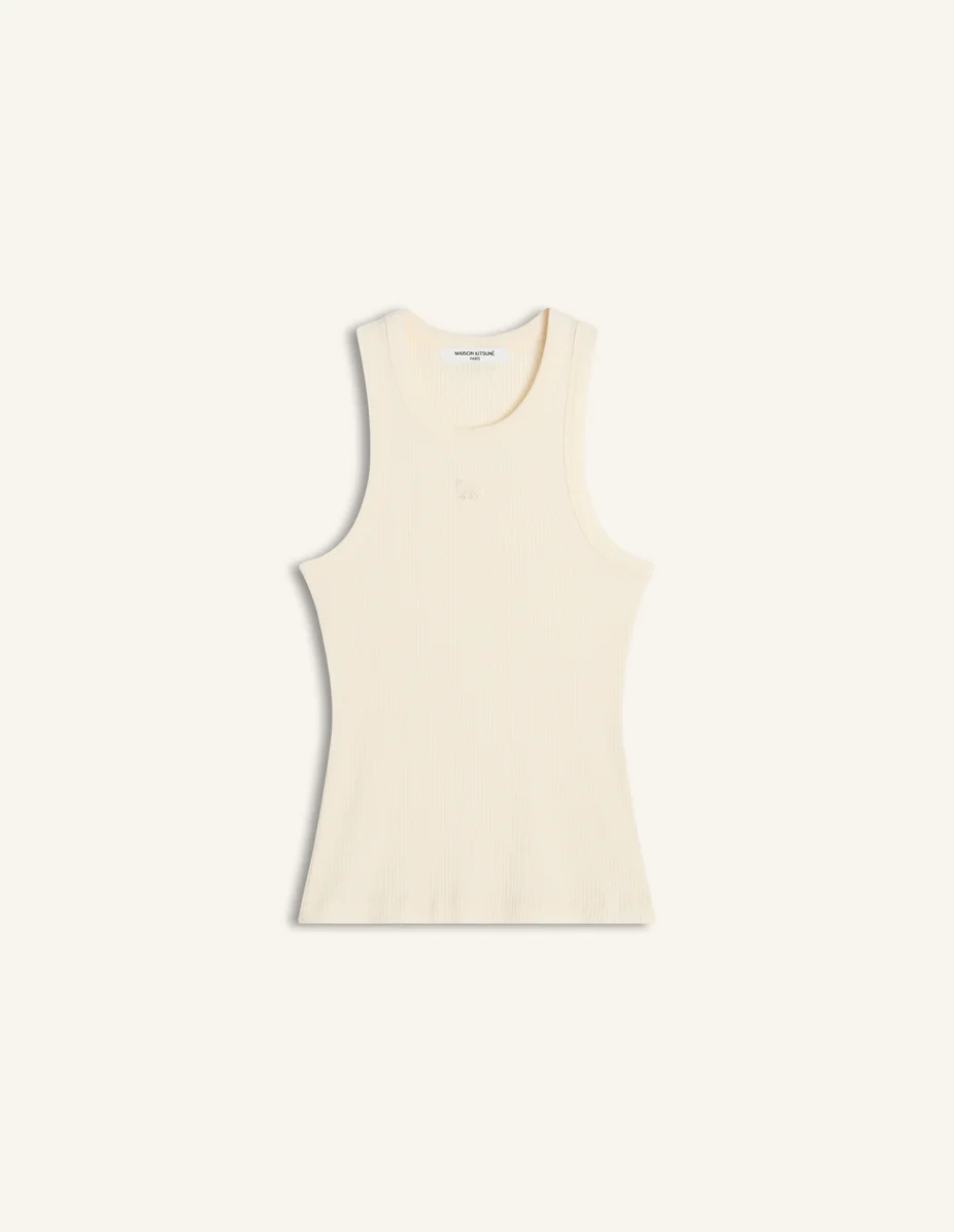 DETAILS Tank top in refined rib. Fitted cut with Baby Fox embroidered patch on the chest. - Refined rib tank top - Fitted cut - American neckline - Ribbing at the neckline and armholes - Tonal Baby Fox embroidered patch on the chest OW00604KJ0134-0383 SIZE & CUT Cut: FITTED Sizing: WOMEN The female model is 5.8 tall and wears a size S MATERIAL 32% COTTON, 4% ELASTANE, 64% LYOCELL TRACEABILITY Made in Portugal