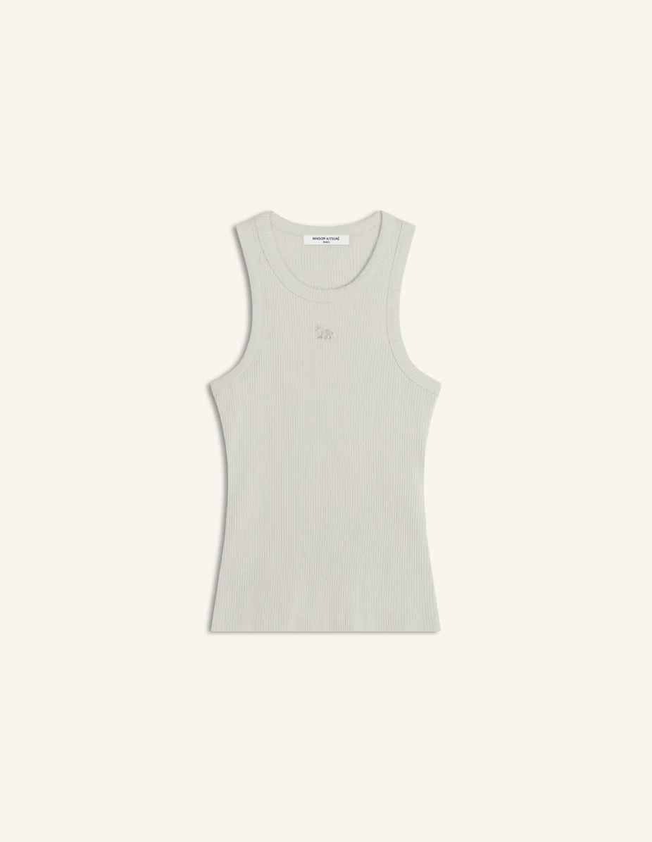 DETAILS Tank top in refined rib. Fitted cut with Baby Fox embroidered patch on the chest. - Refined rib tank top - Fitted cut - American neckline - Ribbing at the neckline and armholes - Tonal Baby Fox embroidered patch on the chest OW00604KJ0134-0477 SIZE & CUT Cut: FITTED Sizing: WOMEN The female model is 5.7 tall and wears a size S MATERIAL 32% COTTON, 4% ELASTANE, 64% LYOCELL TRACEABILITY Made in Portugal