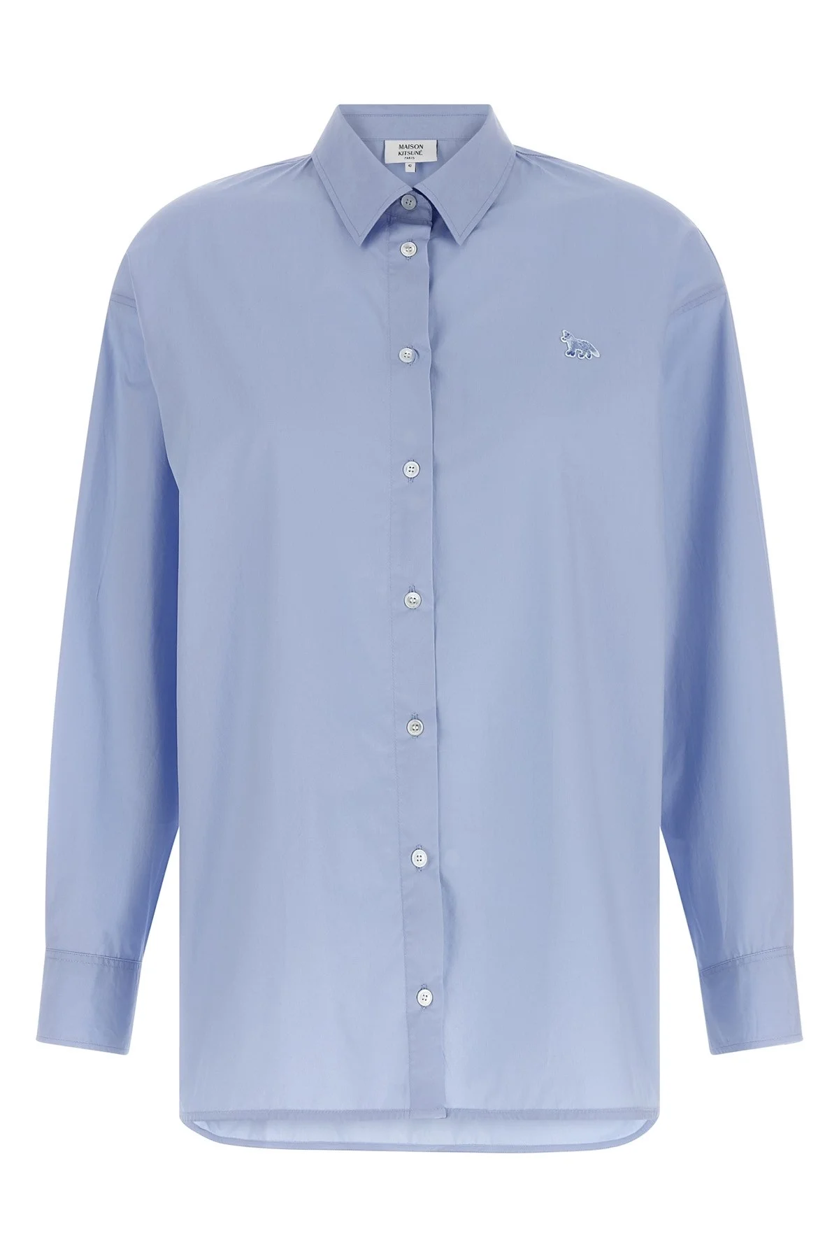 cod. QW00414WC50890434 Cotton poplin shirt, tone-on-tone 'Baby Fox' patch and front mother-of-pearl button closure, pointed collar, long cuffed sleeves, side slits on a rounded hem. Color: Blue Size & Fit: true to size fit - FRENCH size Composition: 100% cotton Made in: Morocco